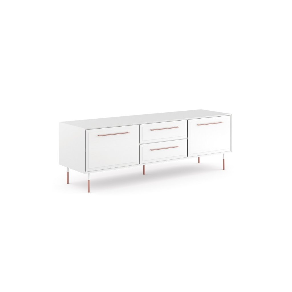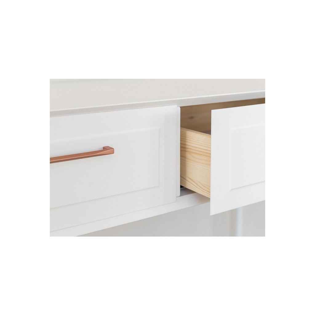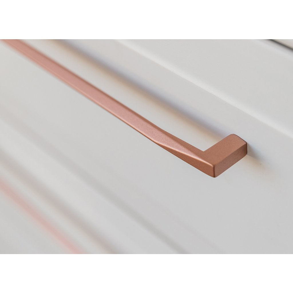 Nábytek ROSA BIANCA je ozvláštněn úchyty a nožičkami v barvě růžového zlata, které jsou šperkem k nábytku