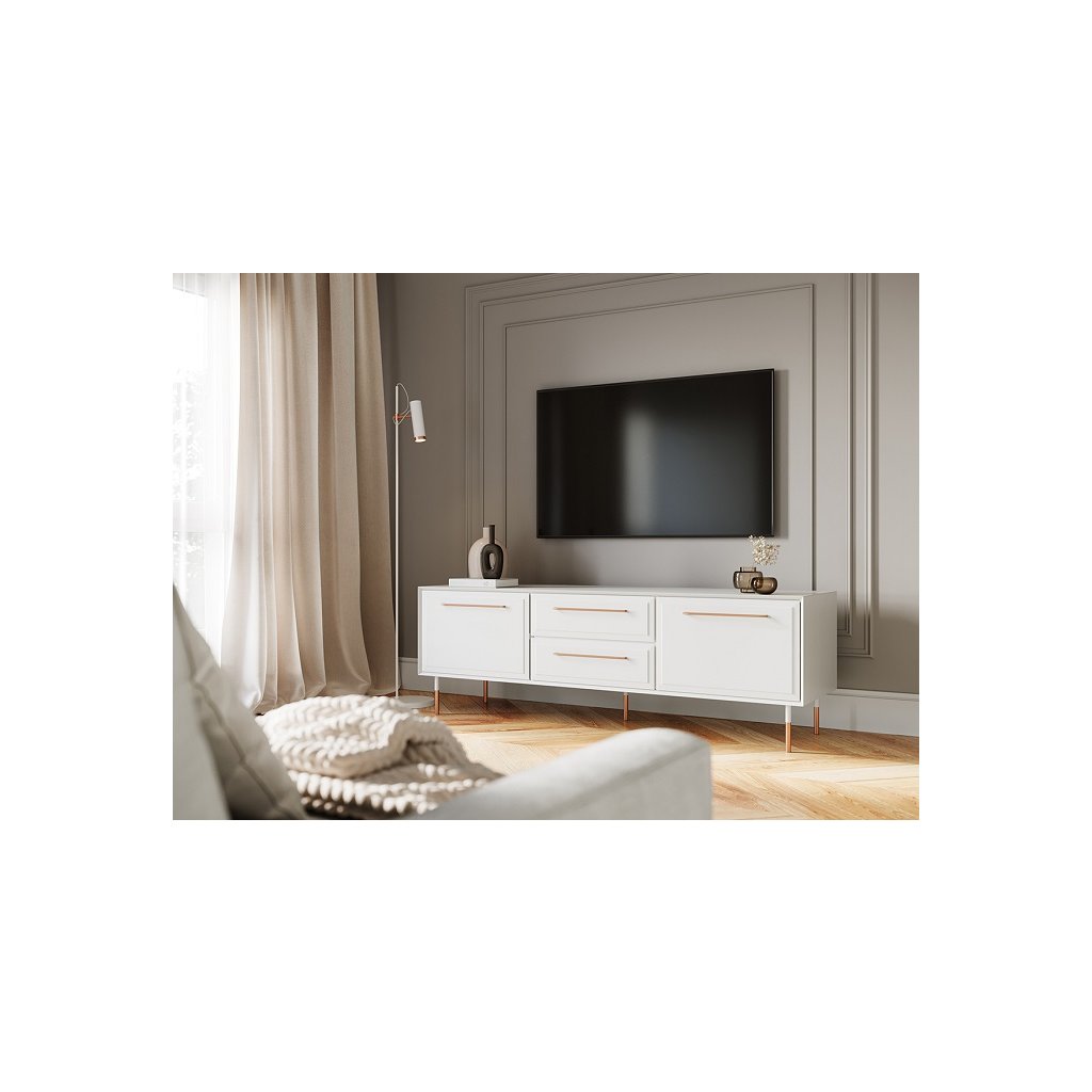 Zařizujete si u vás doma televizní zónu? Jak už název napovídá, nemůže chybět televizor, audio aparatura, konzole nebo jiné vybavení, o kterém sníte. Všechny funkce zastane tato praktická komoda pod TV, která je vybavena zásuvkami na drobnosti (kabely, nabíječky, baterie do dálkového ovladače). Za skříňkami se nachází praktická police a zásuvka, které vám pomohou uspořádat věci. Zásuvky jsou namontovány na vodících lištách s tichým dojezdem, které zajistí váš klid a pohodu v obývacím pokoji. Pokud se rozhodnete televizi pověsit na stěnu, získáte také prostorné prostory pro vystavení dekorací či suvenýru z cest.