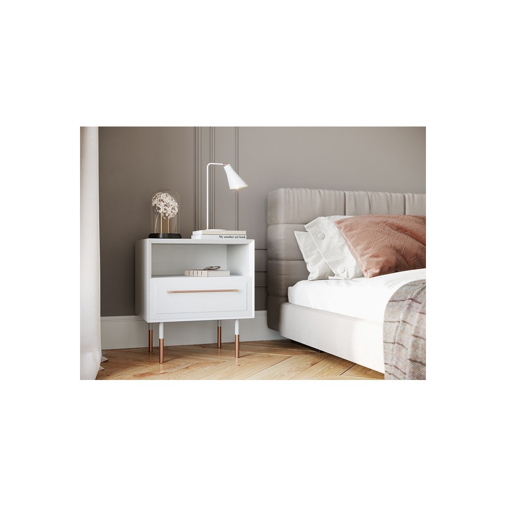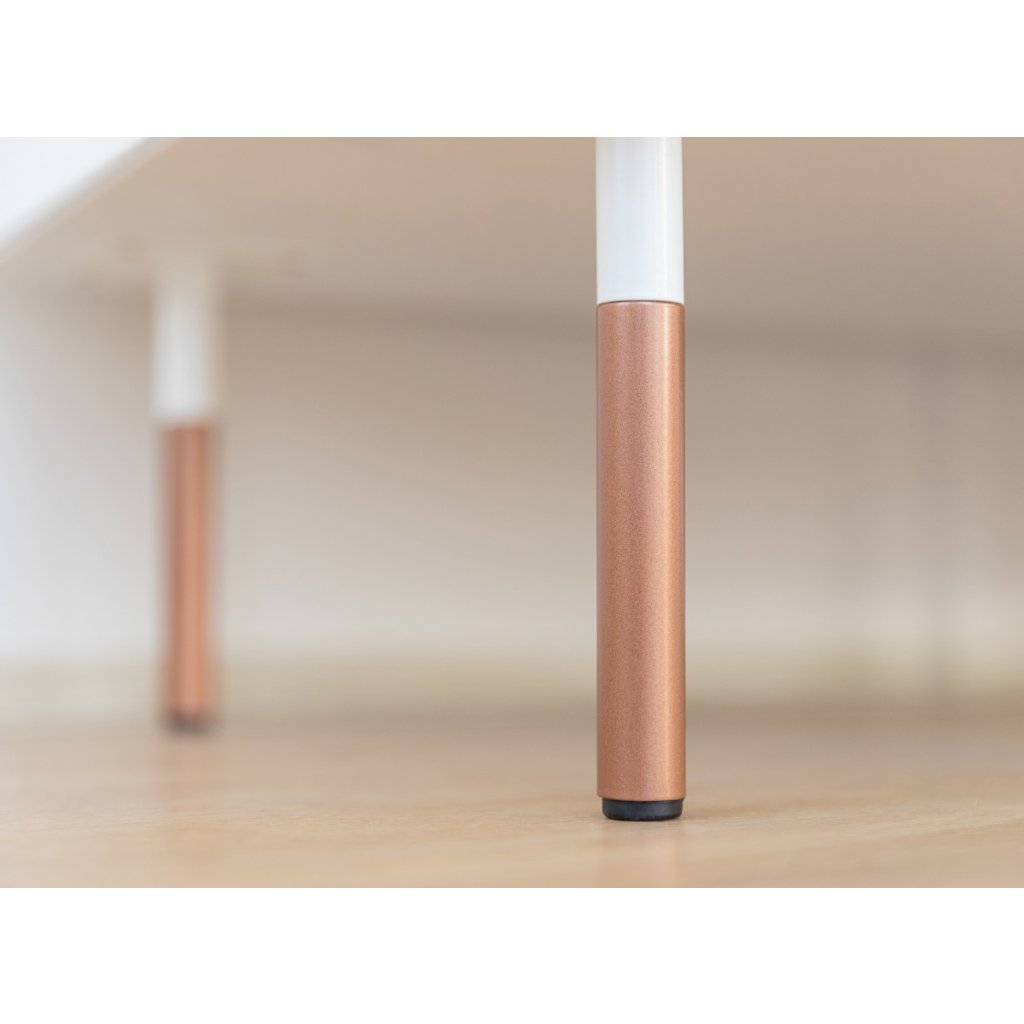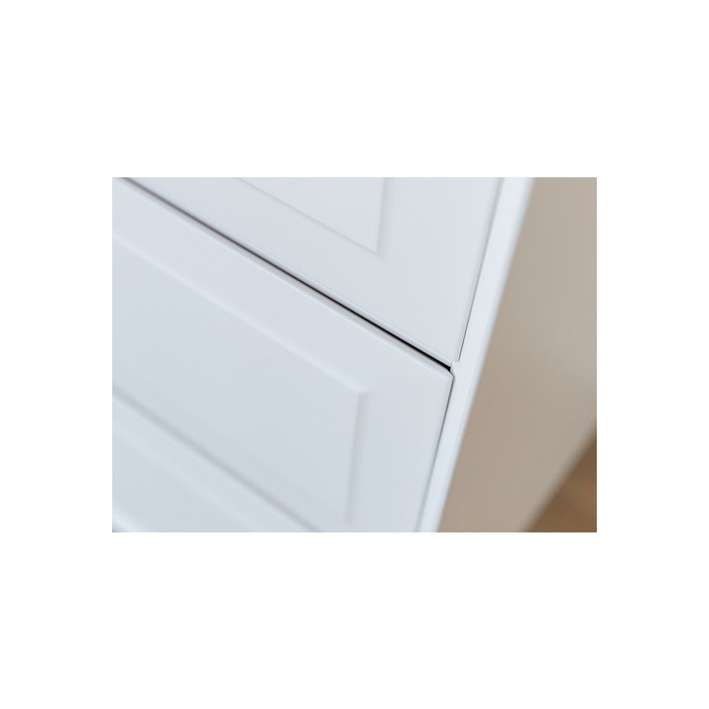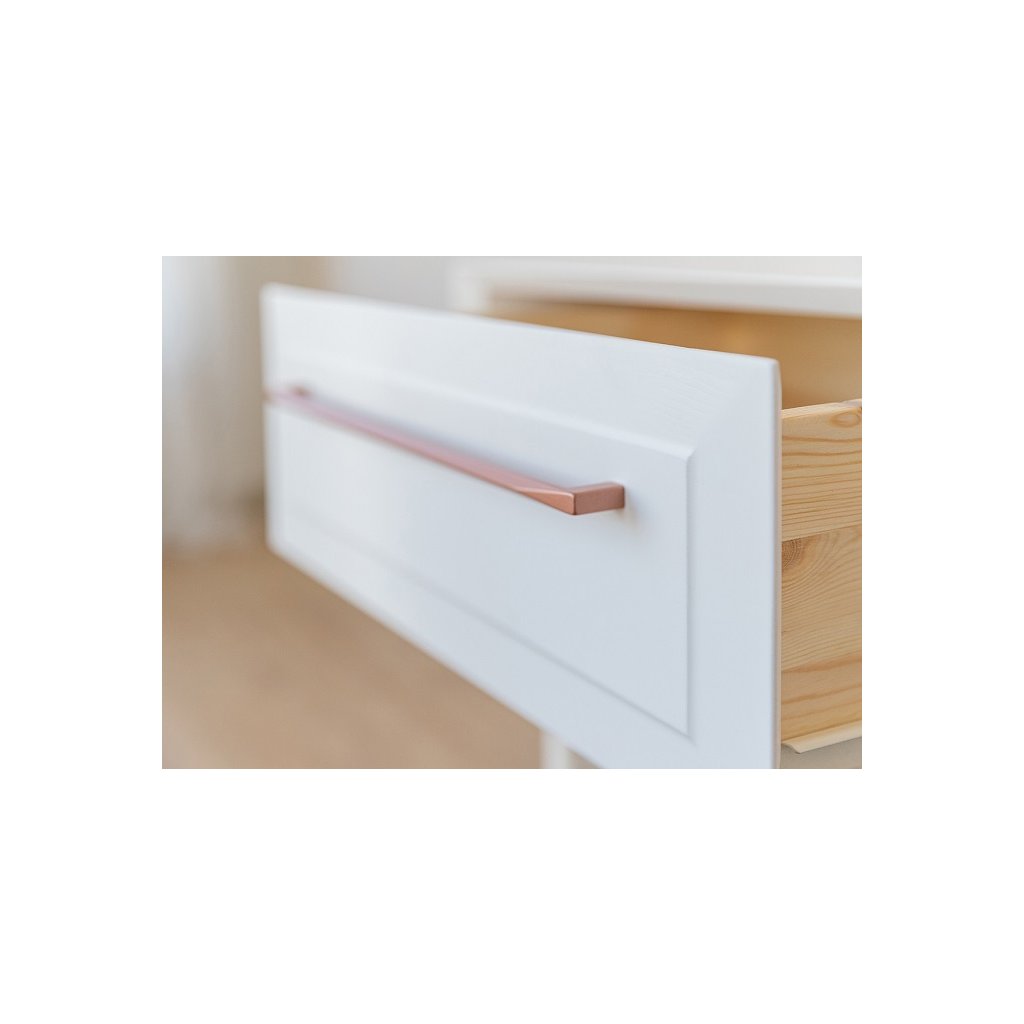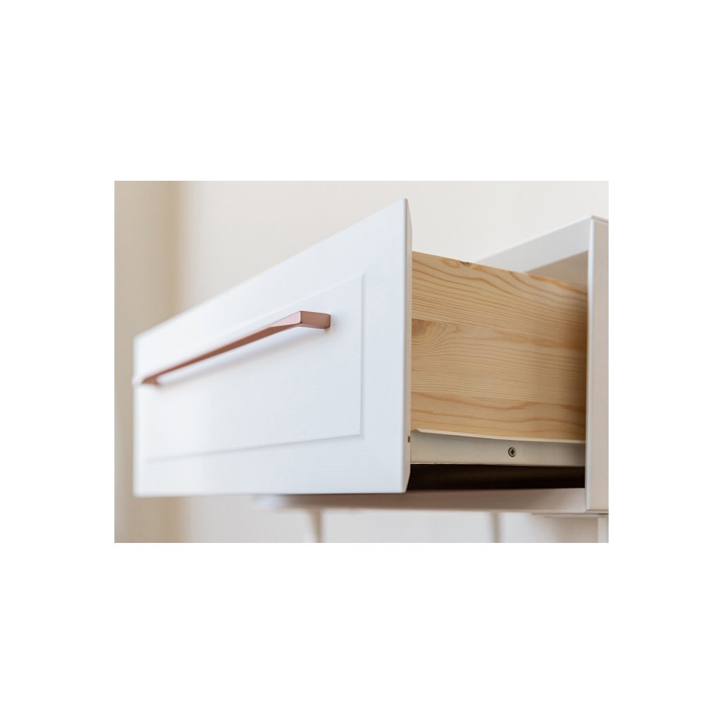 Elegance, nadčasový styl, vysoká kvalita a smysl pro detail charakterizují naši novou kolekci s názvem ROSA BIANCA. Minimalistický nábytek na vysokých nohách, který jen tak nelze přehlédnout. K jeho výrobě bylo použito přírodní dřevo finské borovice, které se vyznačuje nadprůměrnou poddajností, pružností a odolností. Elegantní nábytek ROSA BIANCA kombinuje přírodní dřevo pokryté bílou barvou s lesklými prvky (úchytky a nohy) v růžovém zlatě.