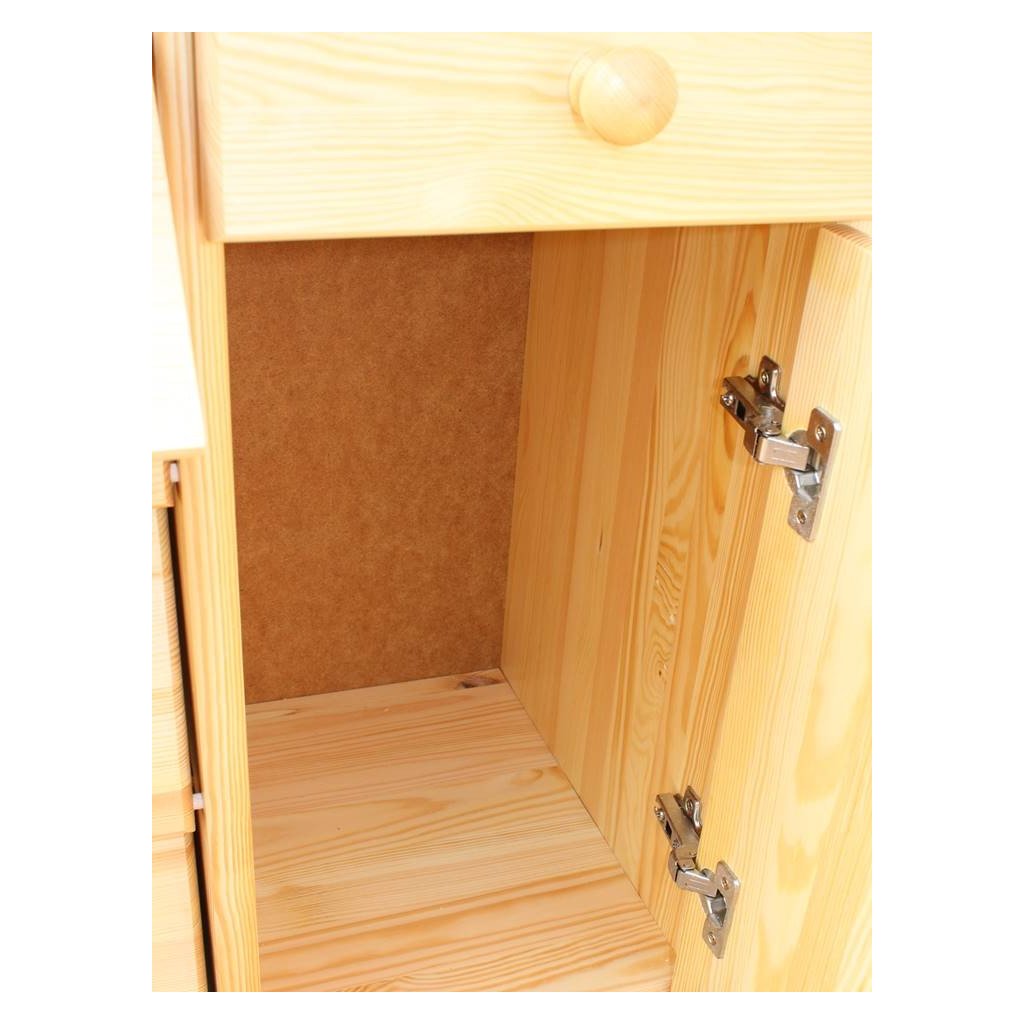 Botník z masivu Šumava 91 je zhotoven z borovicového masivního dřeva v klasickém hladkém stylu, v přírodní barvě. Je ošetřen bezbarvým lakem, který ochrání před drobným poškozením a zároveň dává vyniknout přírodní struktuře dřeva. Má k dispozici čtyři výklopné přihrádky, skříňku a dva menší šuplíky na různé maličkosti. Botník je doplněn o kulaté dřevěné úchyty, které mu dodávají nádech elegance. Zadní stranu tvoří sololit, což je dřevovláknitá deska, vyrobená na bázi dřeva.