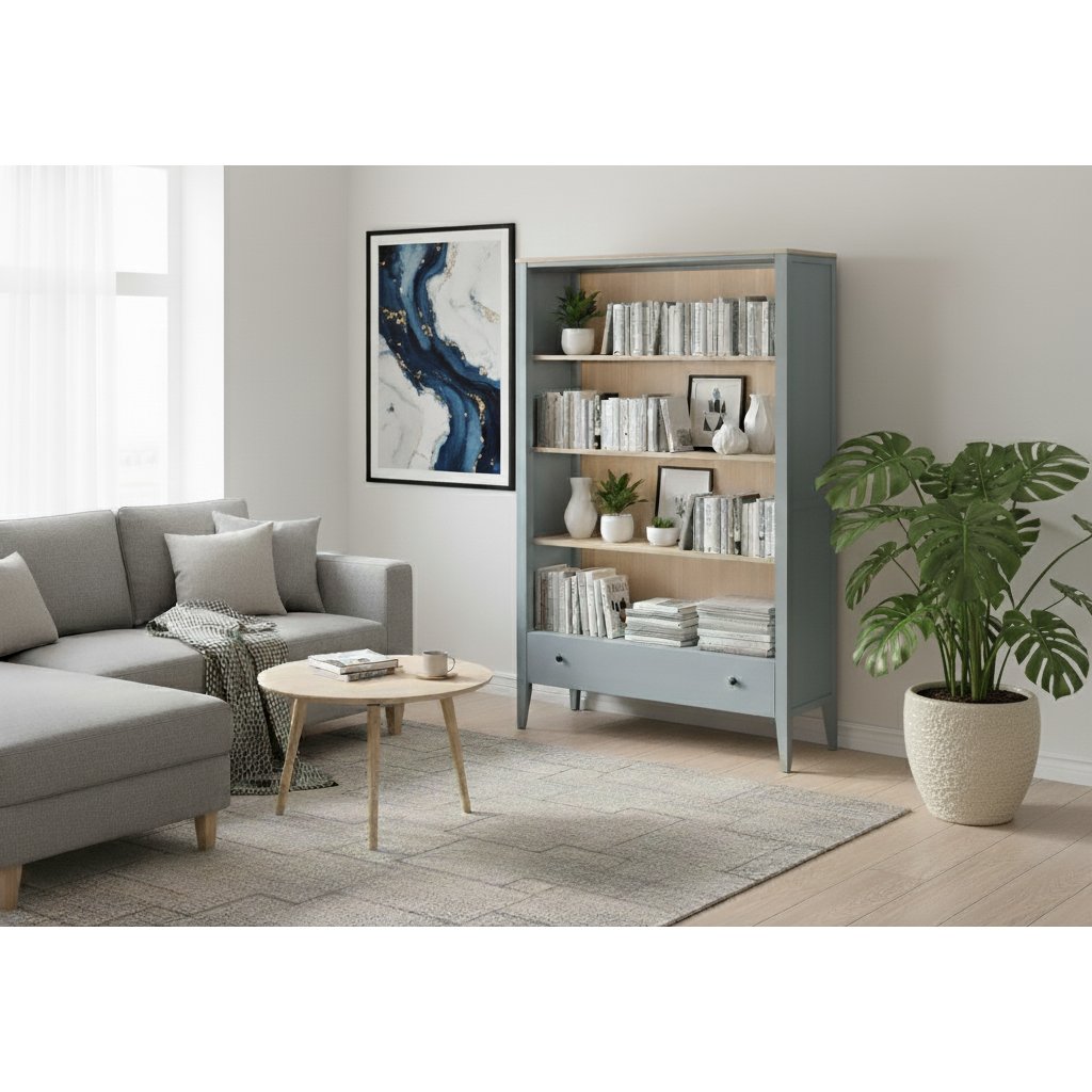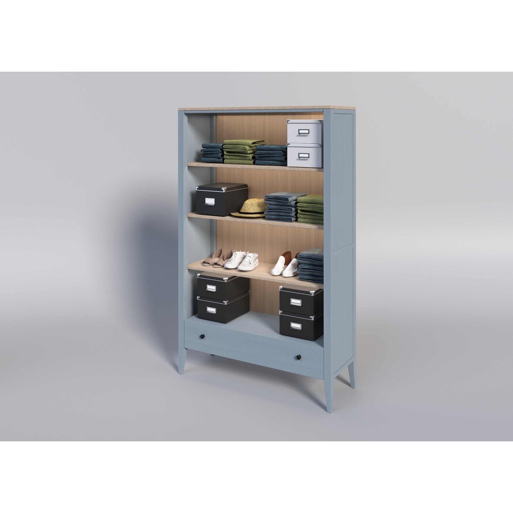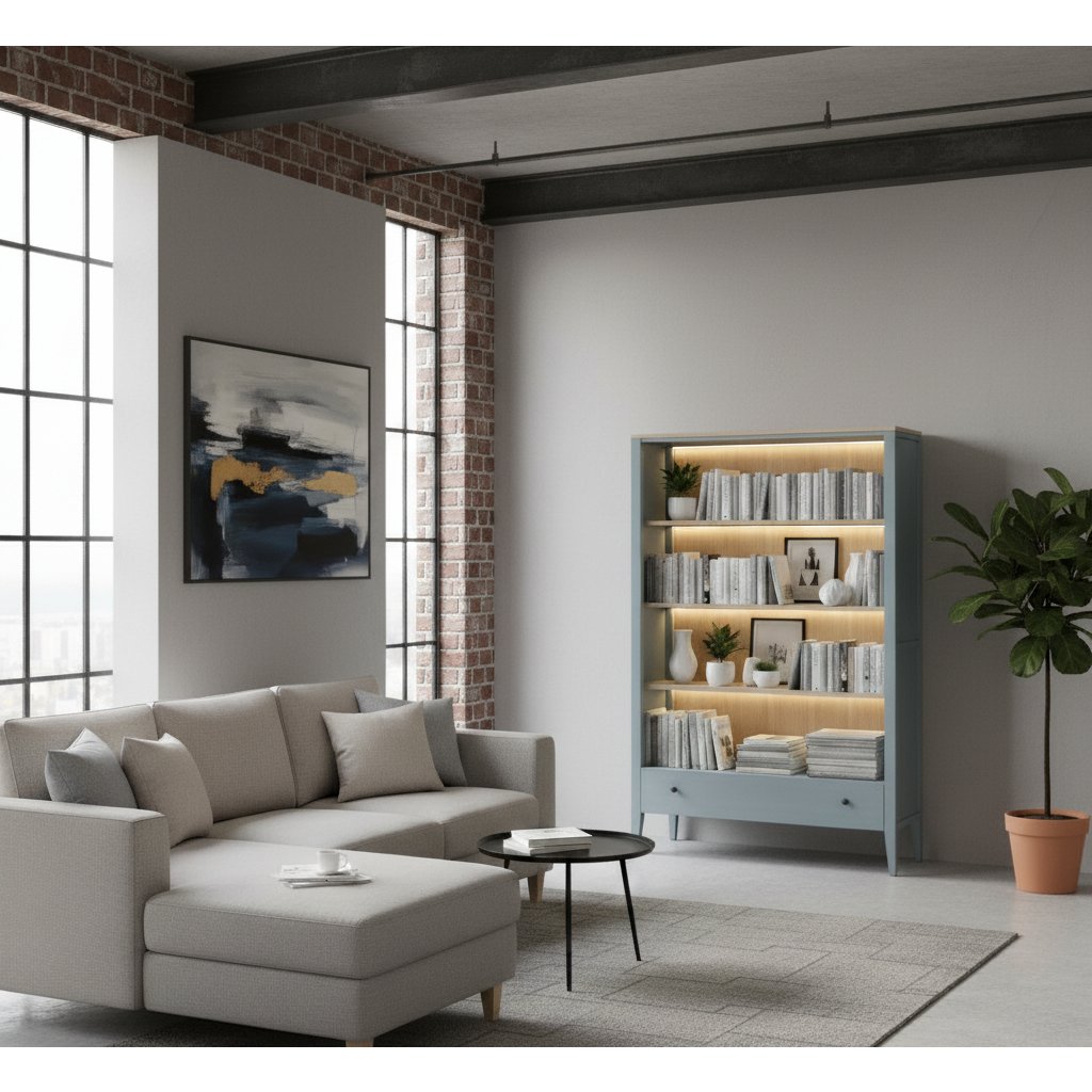 Ekologická elegance: Povrch je ošetřen ekologickou, vodou ředitelnou akrylovou barvou v šedomodrém odstínu. Tato barva zaručuje krásný, matný finiš, je odolná proti opotřebení a zajišťuje, že knihovna je bezpečná pro všechny členy rodiny. Tip pro úklid: Postačí vlhký, měkký hadřík.