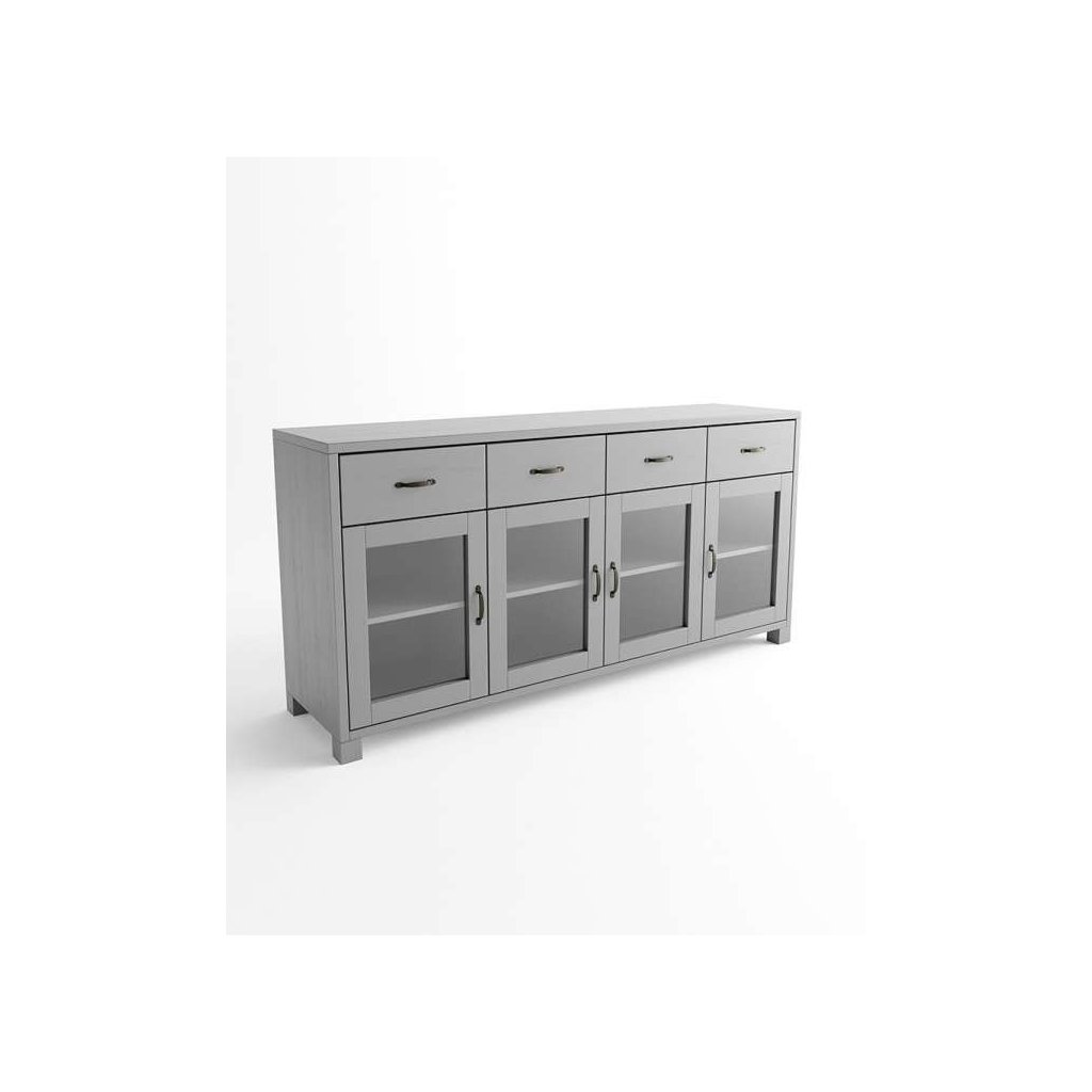 Masivní buková komoda GREY REMUS nabízí dostatek úložného prostoru. Kromě čtyř šuplíků disponuje čtyřmi policemi za zavíratelnými skleněnými dvířky.