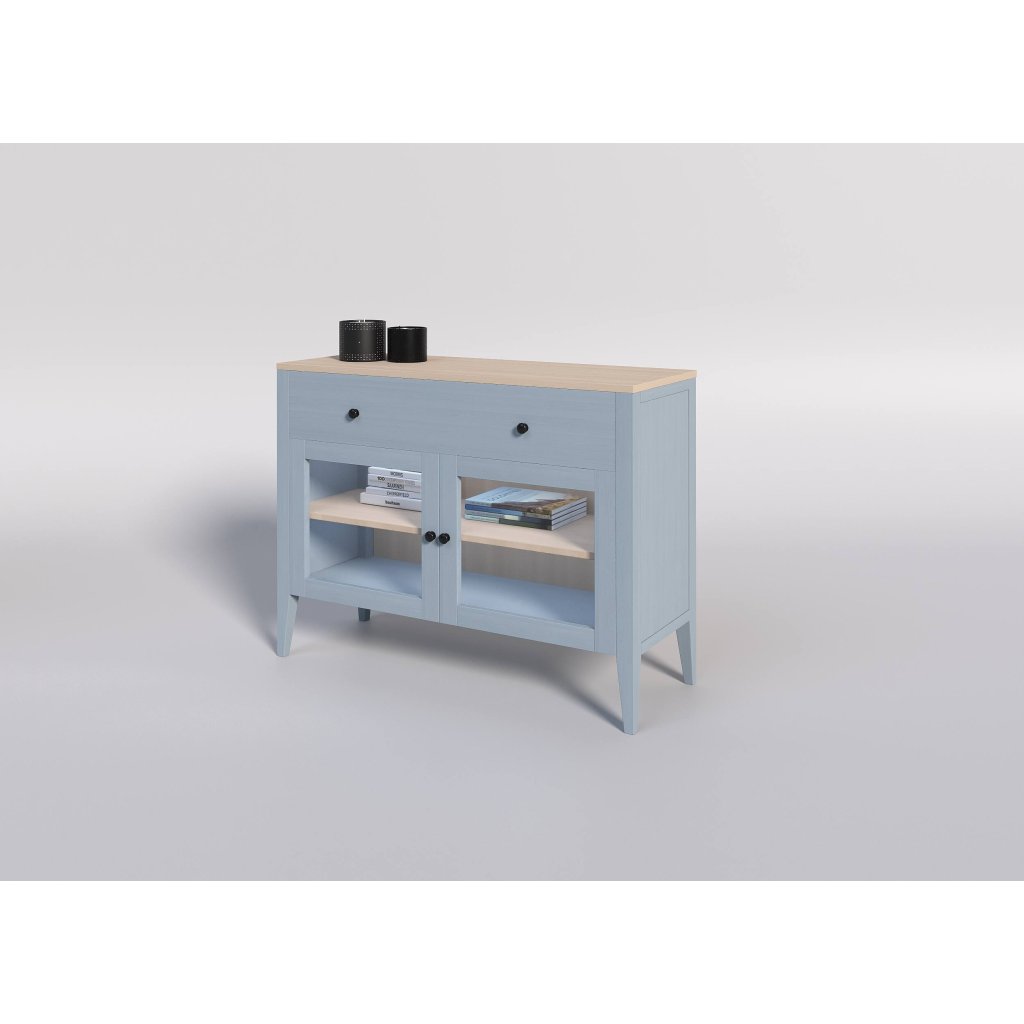 V ROMA KT6 není nic náhoda. Povrch bukového dřeva je ručně broušený a následně ošetřen šedomodrou akrylovou barvou ředitelnou vodou, která zvýrazňuje jeho kresbu a dodává mu jemný, moderní charakter. Na dotek ucítíte přirozenou hladkost dřeva i kvalitní, odolnou povrchovou úpravu, která skvěle vynikne v každém interiéru.