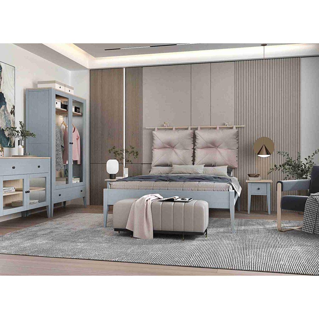 Komoda KT7 je součástí širší kolekce. Doplňte ji o další masivní prvky v šedomodré barvě, jako je Buková vitrína Roma SST4 šedomodrá nebo Buková kredencí Roma KRT4 šedomodrá.