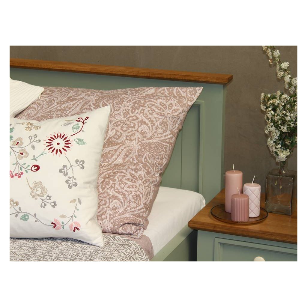 Masivní postel PROVENCE je spojením bukového a dubového dřeva. Dubové dřevo (horní deska) je ošetřeno lakem a bukové dřevo je ošetřeno akrylovou barvou v olivovém odstínu.