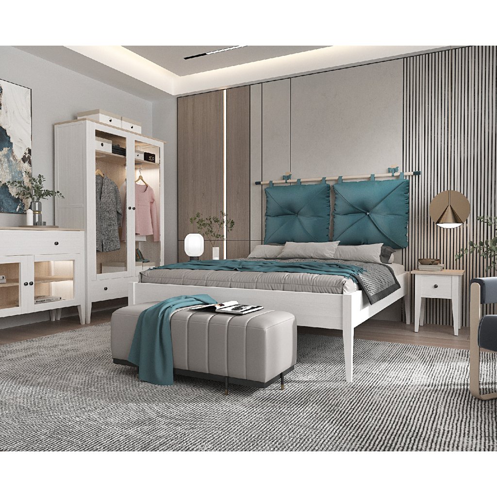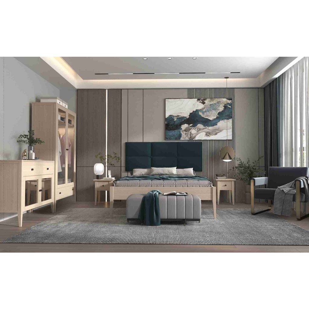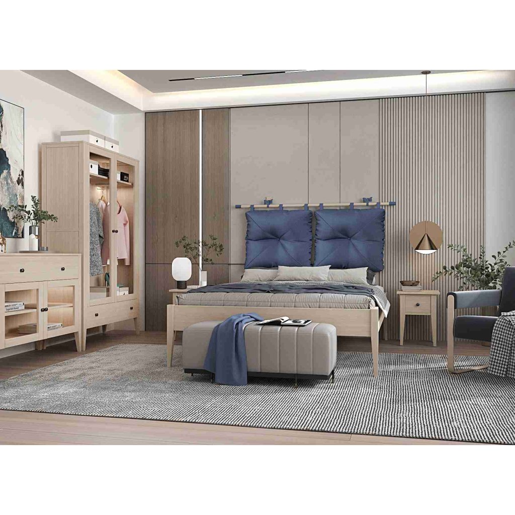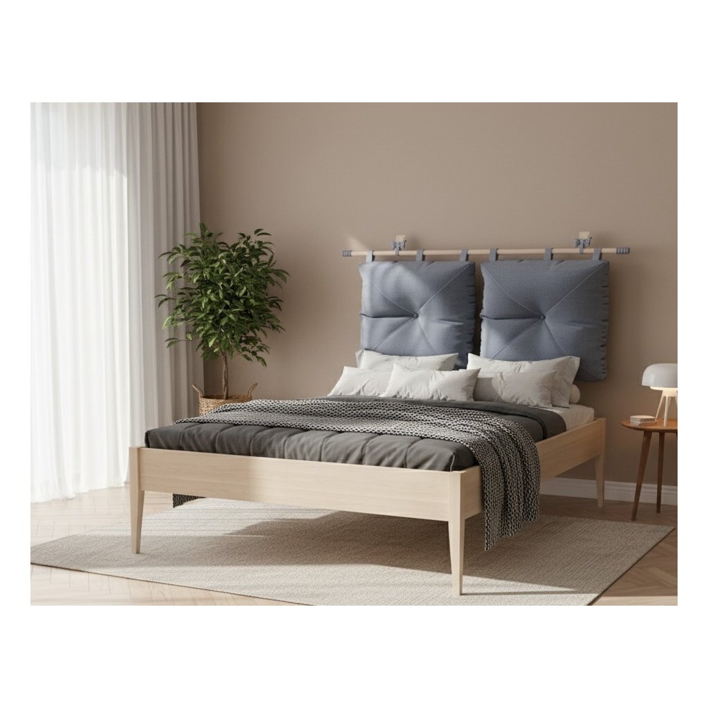 Buková postel ROMA vyniká závěsným čalouněným čelem s volitelnou barvou potahu.