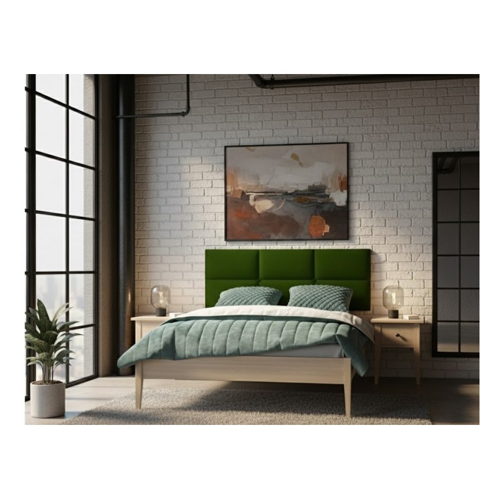 Buková postel ROMA White vyniká designovým čalouněným čelem s volitelnou barvou potahu.