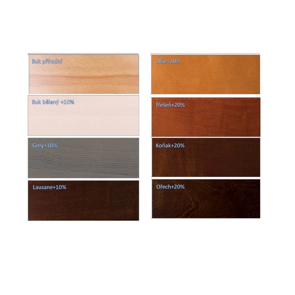 Základní cena nábytku má barvu bukového dřeva. Pokud preferujete raději jiné barevné provedení, je možno objednat za příplatek 10% moření v dekoru buk bělený, grey nebo lausane.