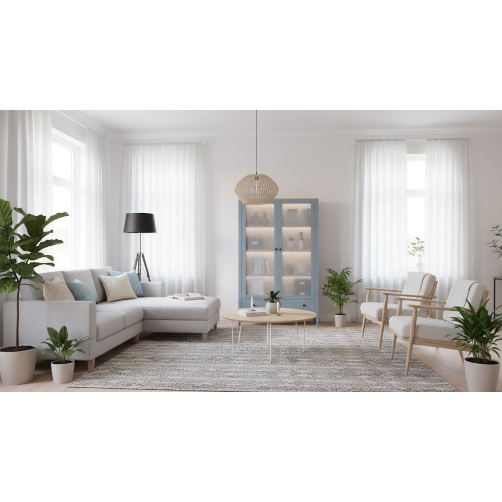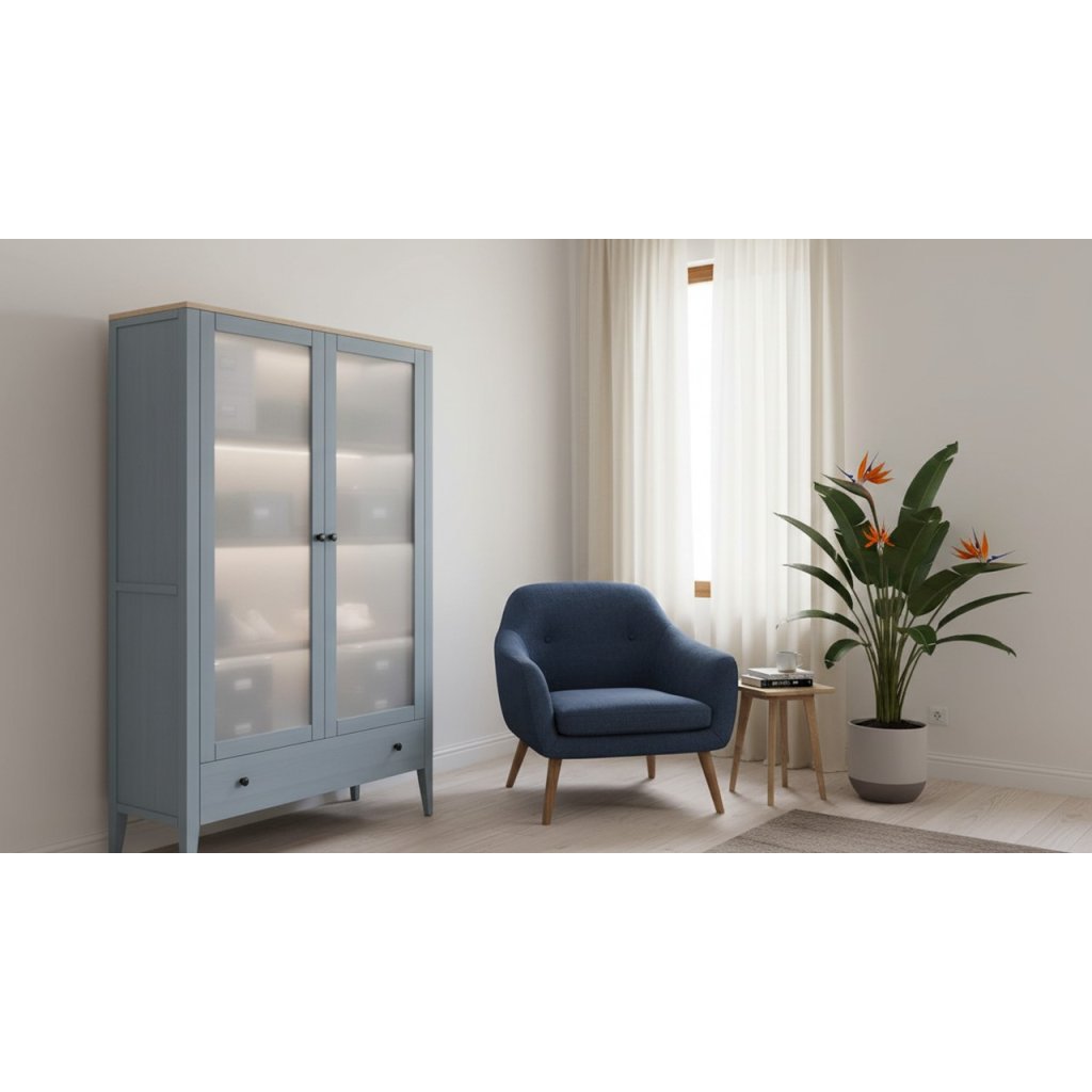 Vitrína, která ukáže to, na co jste pyšní, a schová vše ostatní. Buková vitrína ROMA SST4 v šedomodré kombinuje kultivovaný vzhled a chytře členěný úložný prostor: nahoře police za dvířky pro sklo, porcelán i knihy, dole 1 velký šuplík na textilie a drobnosti. Rozměry 120 × 195 × 45 cm přinášejí velkorysý objem bez zbytečné masy; nohy vysoké 20 cm odlehčují siluetu a usnadňují úklid.