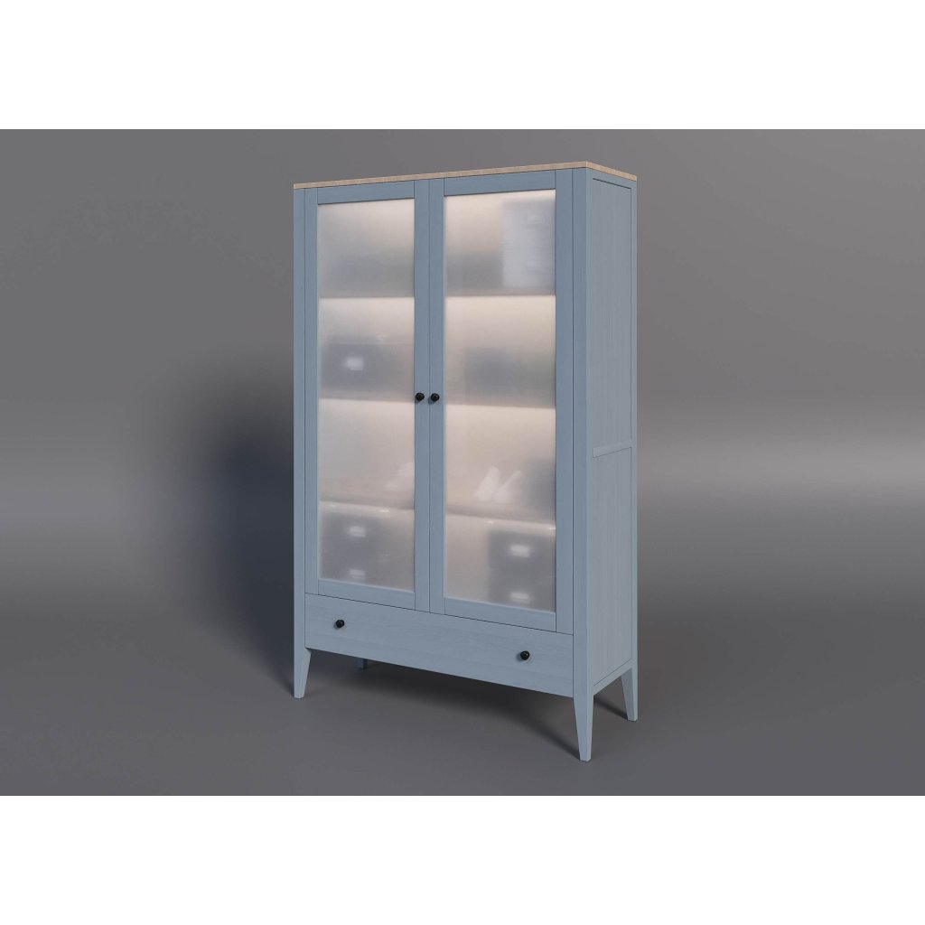 Nosná konstrukce z bukového masivu přináší pevnost, stabilitu a odolnost vůči každodennímu provozu. Přirozená kresba dřeva dodává šedomodré úpravě hloubku a noblesu, která nestárne. Vysoké nohy zajišťují vizuální lehkost – a pod vitrínu bez potíží zajede i robotický vysavač. Údržba je nenáročná: stačí jemný hadřík.