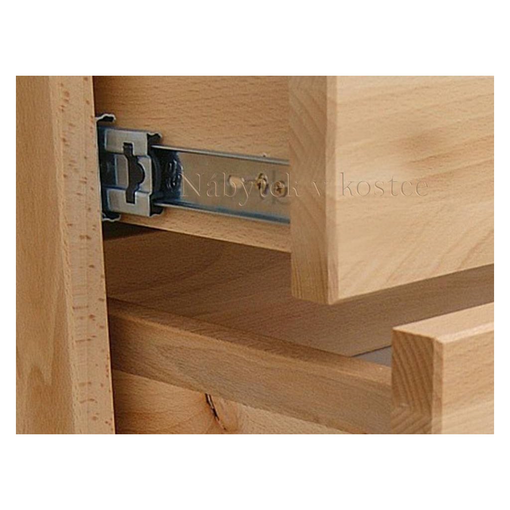 Bukový noční stolek BORA 27 je designová a velmi elegantní dřevěná komoda, vyrobená výhradně z jakostního bukového masivního dřeva (jen záda tvoří sololit). Tloušťka použitého materiálu a bezúchytkový systém ji staví do světel opravdového luxusu. Zásuvky na kolejničkách s plným výsuvem a s kulatými kovovými úchyty lze na přání (za příplatek) doplnit o systém tichého dovírání. Noční stolek má dřevěné nohy.