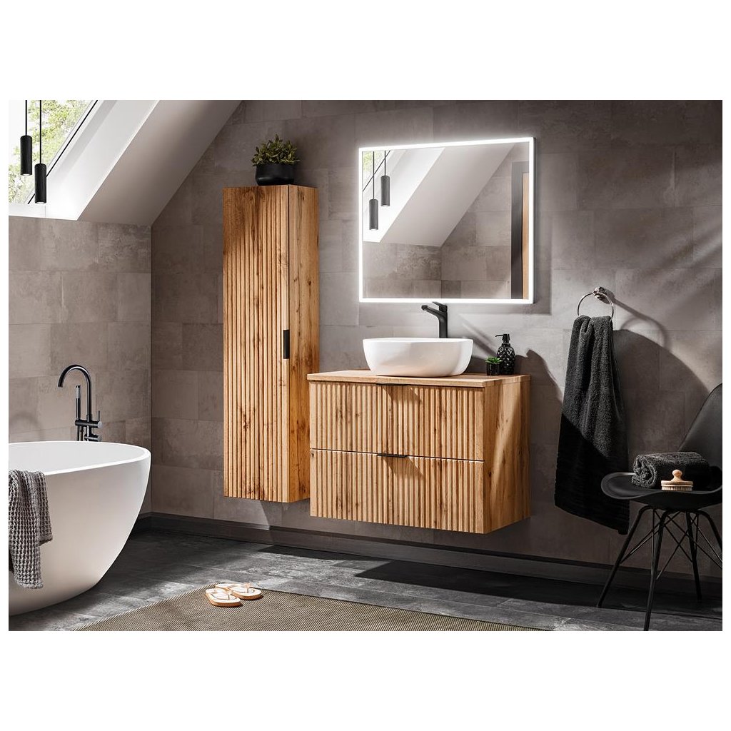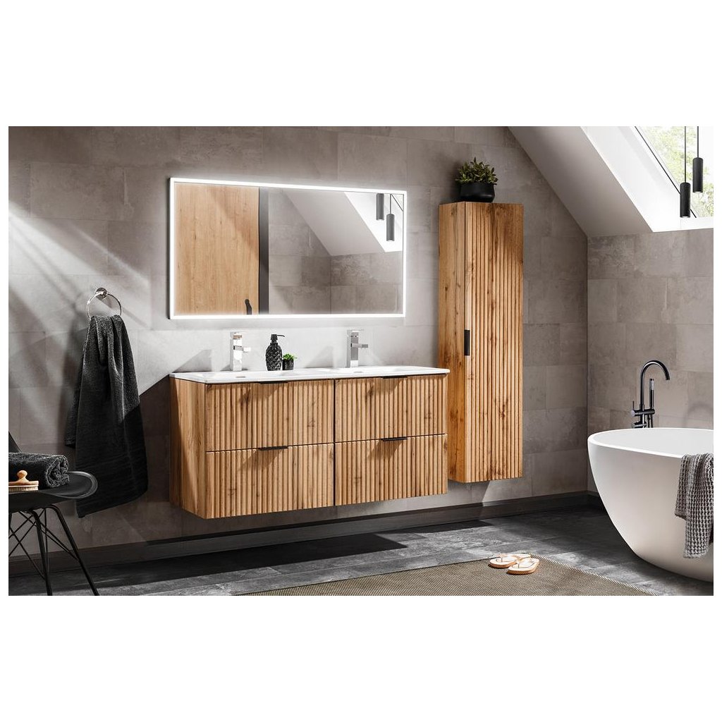 Kolekce Ama dub představuje moderní frézovaný koupelnový nábytek, který je vyroben z kvalitních materiálů ve stylovém dubovém provedení. Kolekce byla navržena s ohledem na praktičnost při současném zachování elegantního vzhledu. Veškerý nábytek z kolekce je proto nástěnný a šuplíky i čela skříněk jsou vybaveny systémem tichého dovírání.