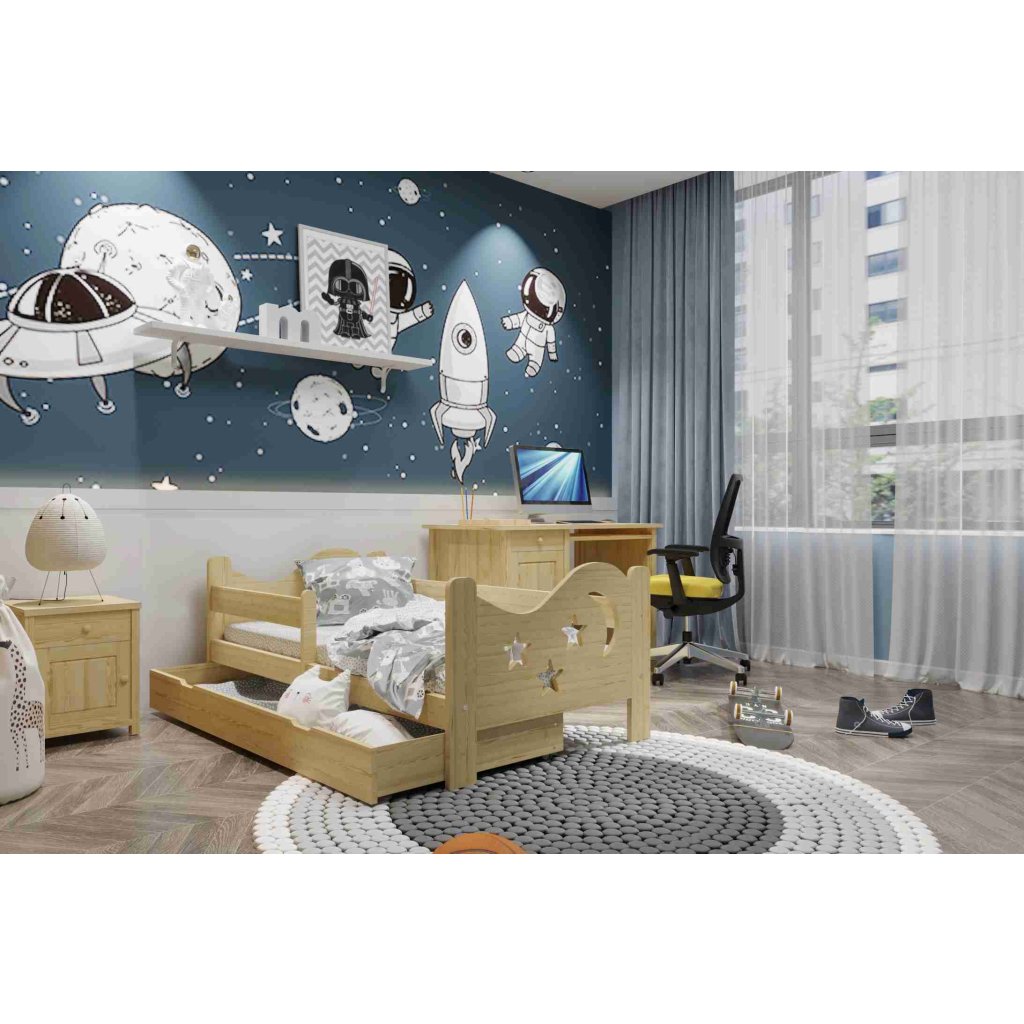 v ideálně doplňuje noční stolek z masivu SN05 se šuplíkem a dvířky nebo noční stolek se dvěma šuplíky SN03. Pro uskladnění dětských věcí je skvělou možností komoda z masivního dřeva a prostorná skříň také z masivu.
