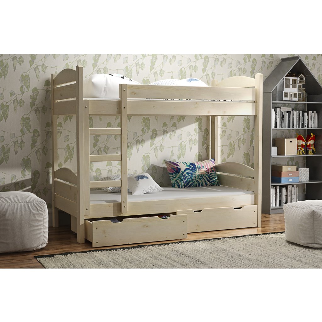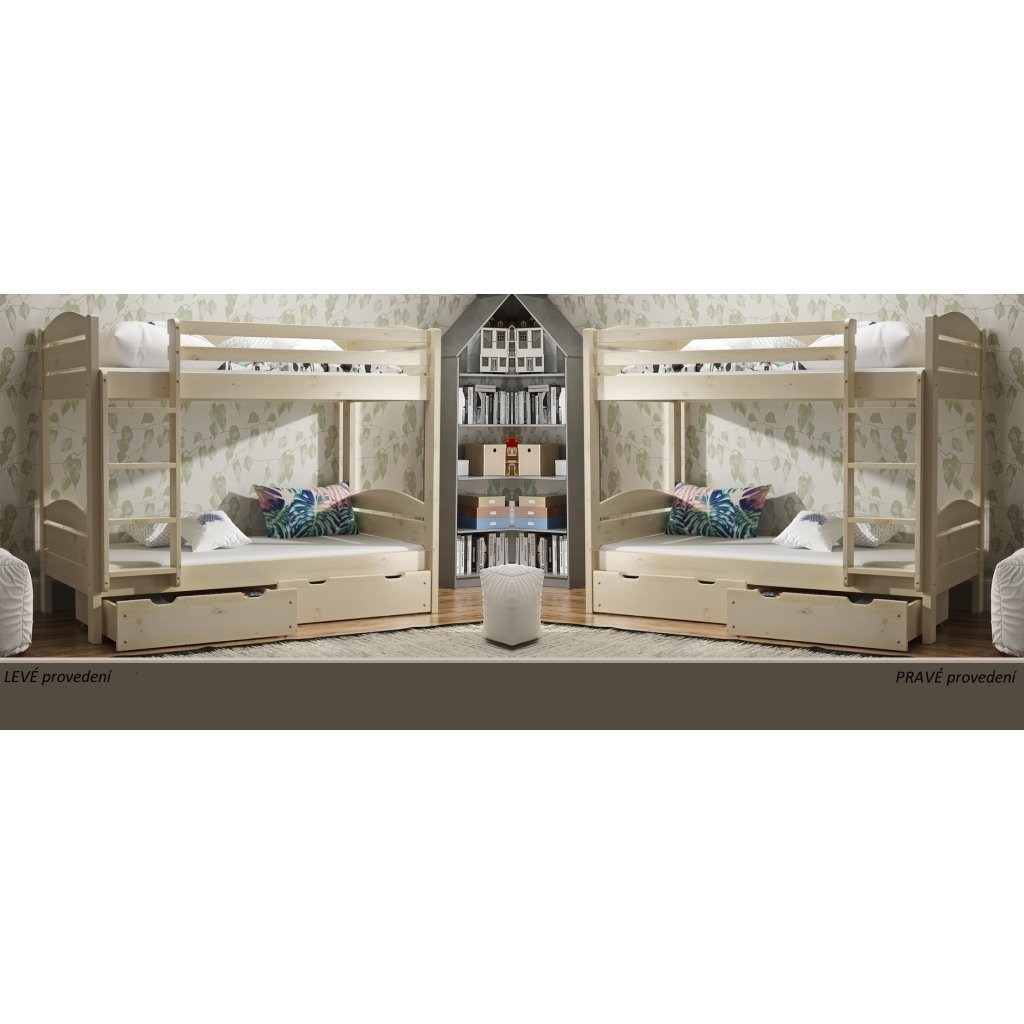 Patrová postel z masivu Petr překvapí vysokou kvalitou zpracování. Je vyrobená ze smrkového masivního dřeva, má bytelnou konstrukci lůžka, masivní nohy (4,5 x 9 cm) a robustní žebřík (levý). Vyznačuje se velkým prostorem mezi konstrukci horní a dolní postele. K jejímu sestavení jsou zapotřebí mosazné šrouby a dřevěné kolíky, které jsou součástí balení. Patrová postel Petr má přední i zadní bezpečnostní bariéry (15cm), které chrání proti vypadnutí z horní postele. Ocenitelné jsou i dvě hluboké a prostorné zásuvky na kolečkách, které jsou snadno vytáhnout z pod postele. Tyto zásuvky jsou ideální k uložení ložního prádla či hraček pro děti. Patrová postel je nalakovaná bezbarvým lakem.