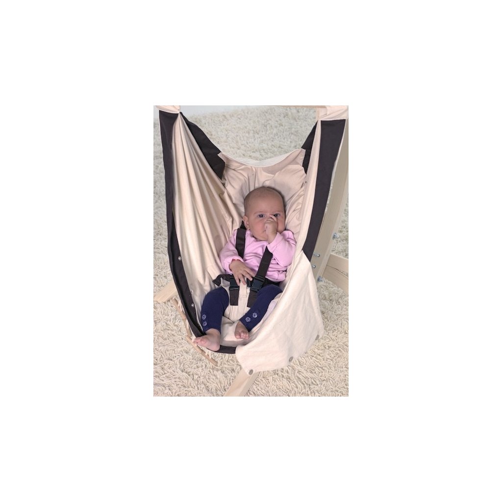 Dětská závěsná houpačka Kangoo je vyrobená z čistě přírodních materiálů. Disponuje zapínatelnou přepážkou, která se používá u novorozenců, a všitými kalhotkami pro bezpečné zajištění dítěte. V oblasti nohou dítěte se kolébka uzavírá na dřevěné kolíčky.