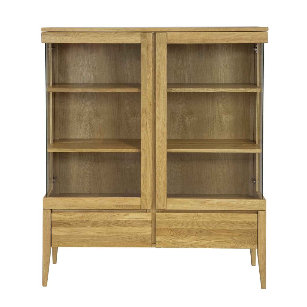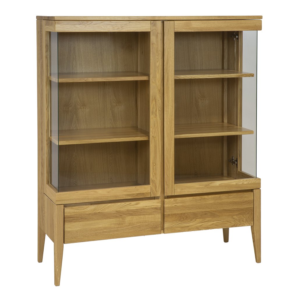 Dubová vitrína má nízký tvar a prosklená dvířka, která vám umožní elegantně vystavit vaše oblíbené předměty. Dvě police uvnitř umožní uspořádané uložení různých doplňků, dekorací a knih. Dvě zásuvky umístěné pod skleněnými dvířky navíc poskytnou další prostor pro drobnosti.