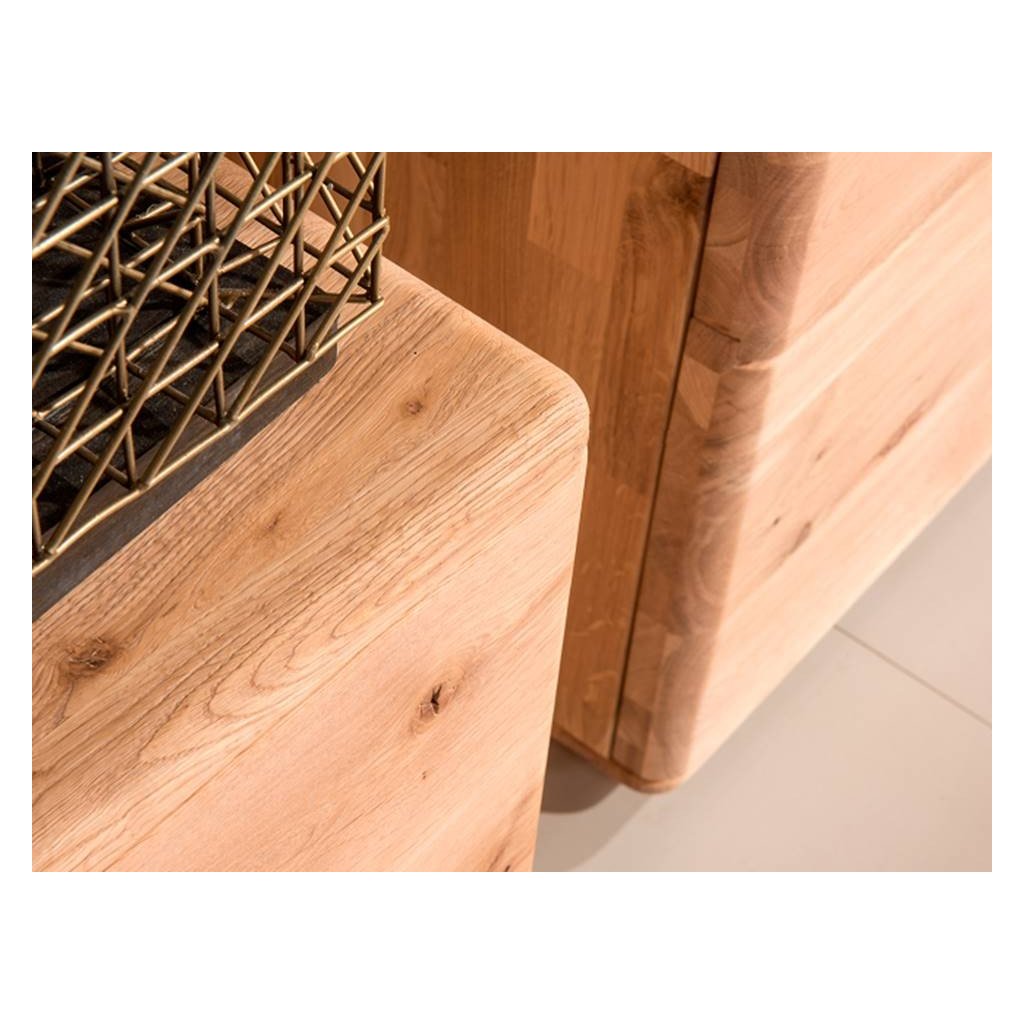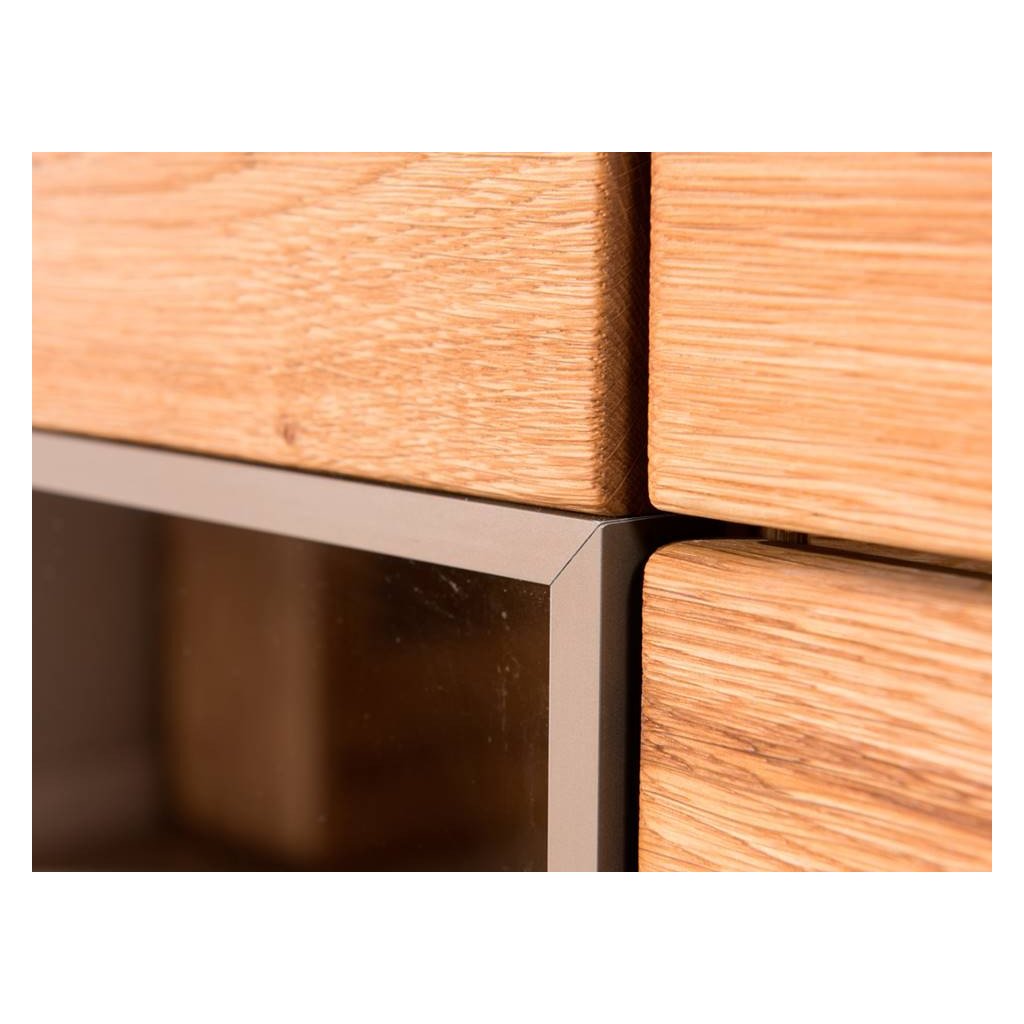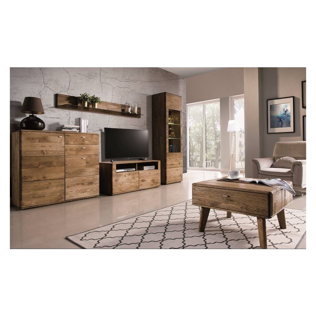 Dubový nábytek do obývacího pokoje VEGAS - TEXAS vyniká svými zaoblenými hranami a stylovými kovovými úchyty. Zásuvky jsou opatřeny systémem tichého dovírání.