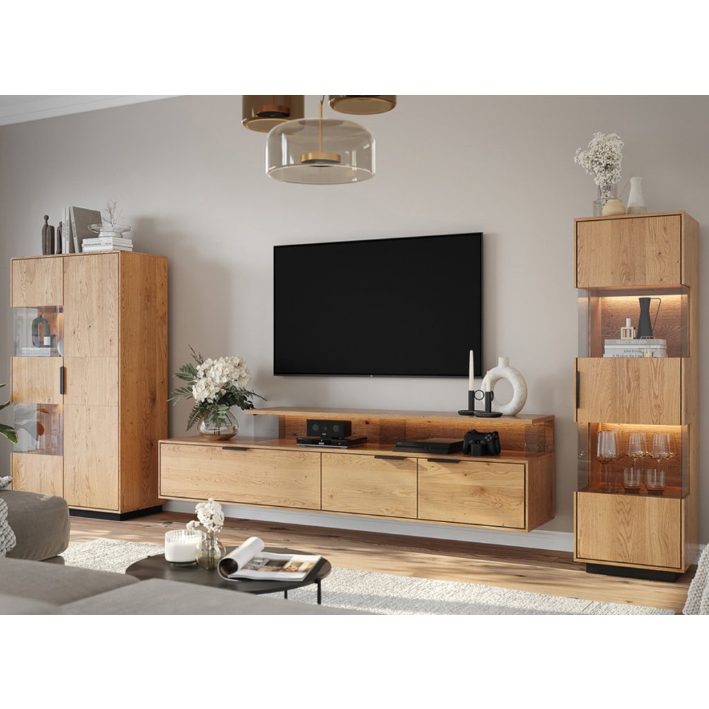 Dubová vitrína Ardano 1D zaujme svou masivní, ale zároveň moderní estetikou. Přirozená krása dubového dřeva je zdůrazněna výraznými suky a kresbou, zatímco zlatavý odstín dodává teplo a eleganci. Minimalistická forma vitríny ji činí univerzálně použitelnou v interiérech, kde se snoubí estetika s funkčností.