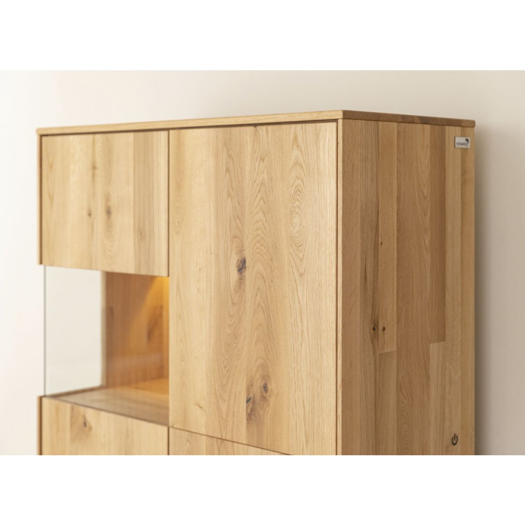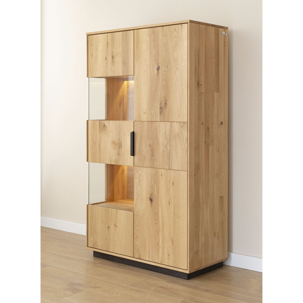 Luxusní  vitrína Ardano je stylová dubová vitrína z masivu, která spojuje moderní design s přírodní estetikou. Zlatavý dekor s výraznou kresbou dřeva a s funkčním vnitřním uspořádáním je ideální pro obývací pokoje, jídelny či pracovny.