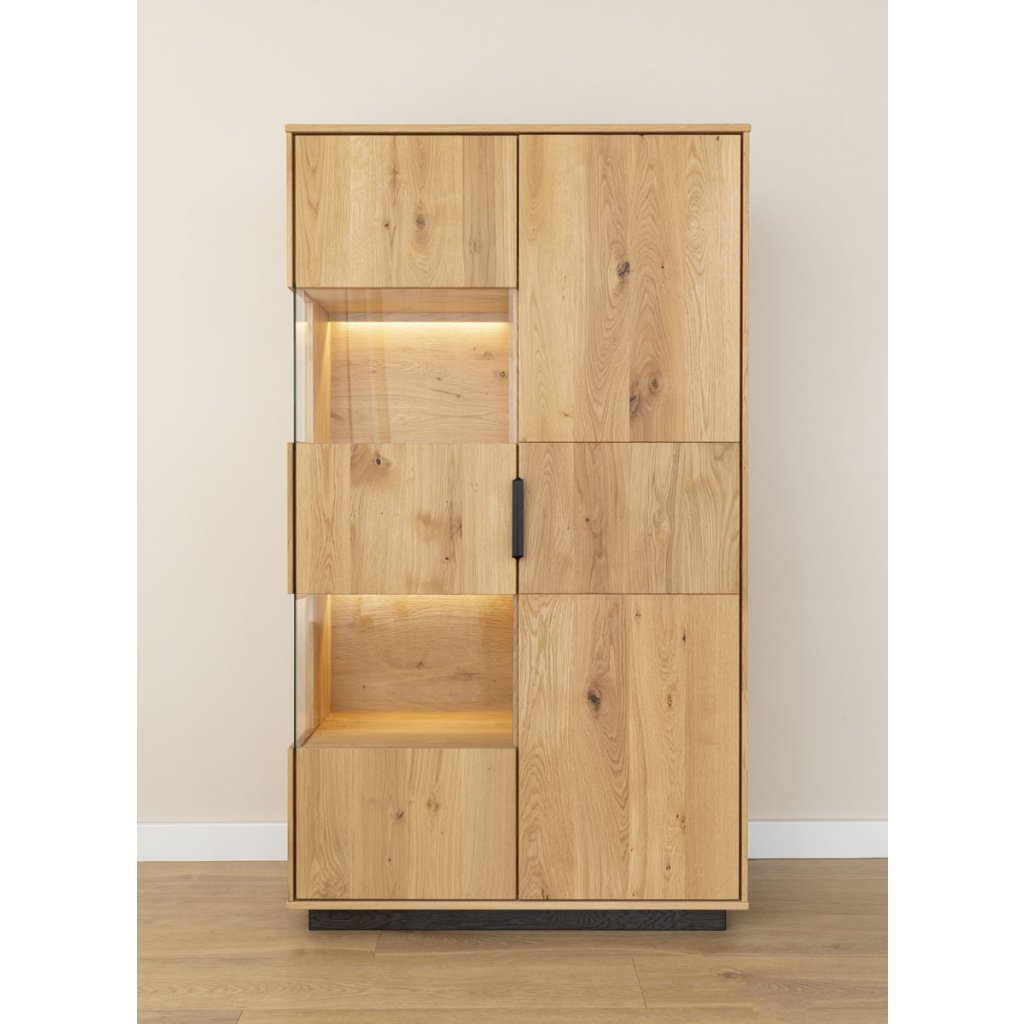Dubová vitrína Ardano v elegantním dubovém dekoru s asymetrickými policemi nabízí moderní design a tiché dovírání.