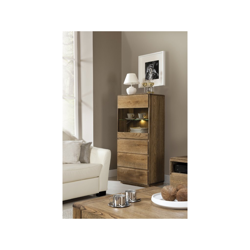 Dubová vitrína PARIS 50 patří do masivní kolekce PARIS, jejíž součástí jsou nejen komody, vitríny a skříně do obývacího pokoje, ale i masivní vyklápěcí postele s úložným prostorem do ložnice. Součástí komody jsou prosklená dvířka, pod nimi se nachází dřevěné frézované dvířka. Po pravé straně jsou dřevěné dvířka a vně jsou police. Dubový nábytek PARIS se díky svému designu hodí do každé domácnosti. Výrazná struktura dřeva, zaoblené hrany nábytku, bezúchytkový systém zavíraní, to jsou detaily, které podtrhují jedinečný design nábytku. Povrch dřeva je ošetřen přírodním olejem německé značky Livos (světový výrobce přírodních barev).