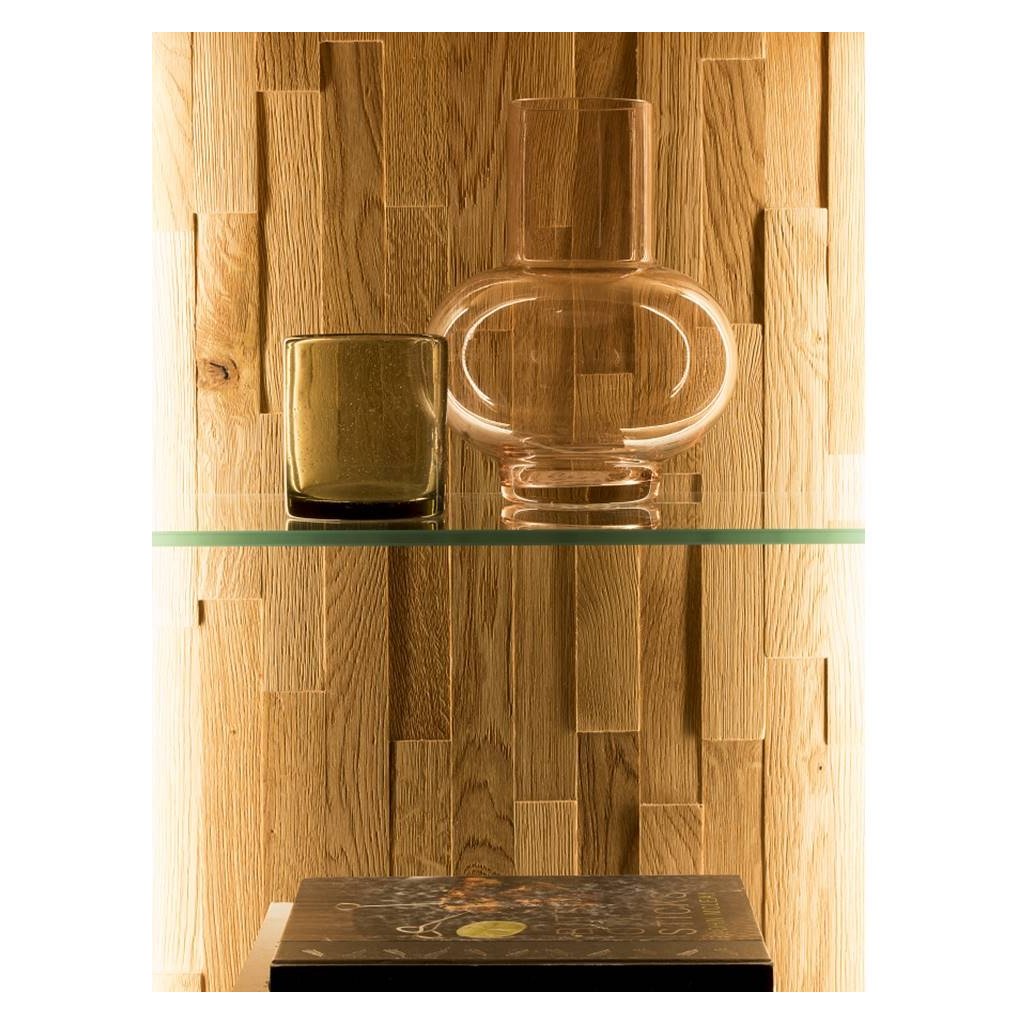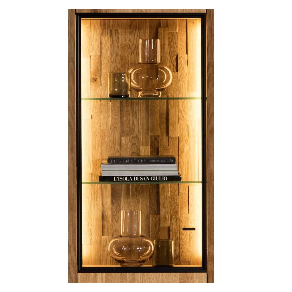 Dubová závěsná skříňka BOGOTA 14 stylová prosklená závěsná skříňka, která se výborně hodí pro interiéry obývacího pokoje, jídelny i pracovny. Prestižní nábytek, který vyzdvihne eleganci a stylový vzhled každé místnosti. Dubový nábytek BOGOTA se díky svému designu hodí do každé domácnosti. Harmonické sloučení kartáčovaného masivního dubového dřeva, dubové dýhy a kovových prvků působí moderním a jedinečným dojmem.