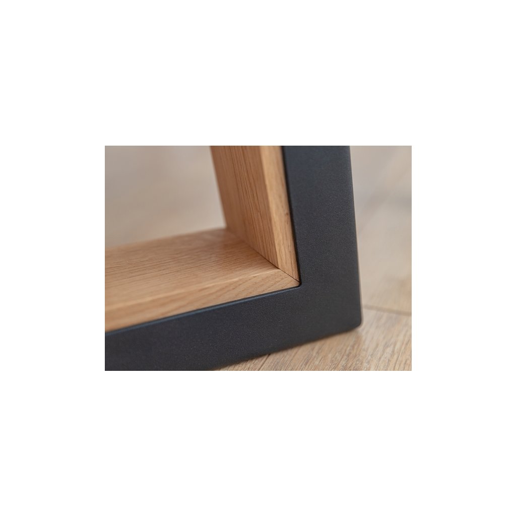 Prezentovaný stůl z masivu lahodí očím estetickou kombinací přírodního, teplého odstínu dubového dřeva se sytou černou barvou jeho kovových noh. Velká deska stolu pak dodává pocit komfortu a pohodlí, který podpoří hřejivou atmosféru při rodinných setkáních.