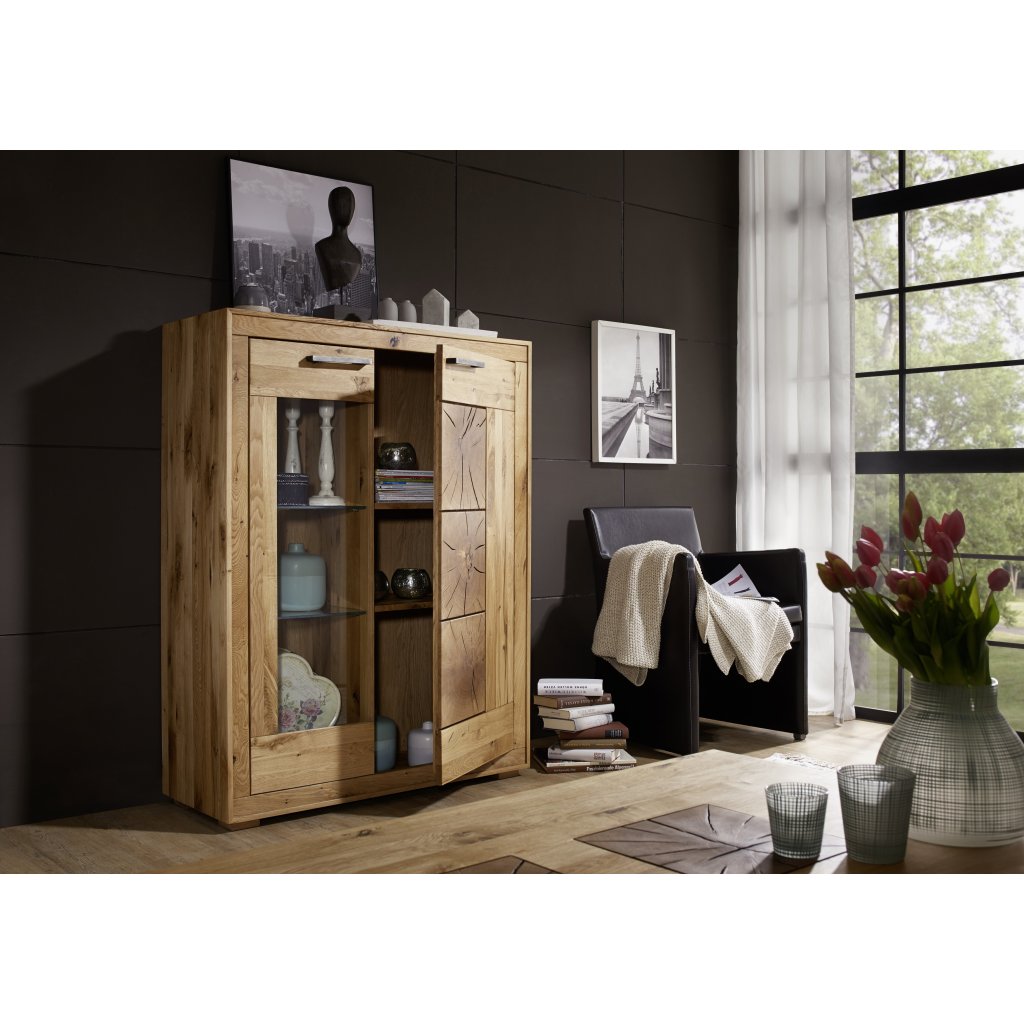 Dvoudveřová kredenc MANDALA z masivu je prosklená kredenc, která poskytne bezpečný úkryt pro Vaše nádobí, dekorační předměty, suvenýry, knížky nebo jiné předměty. Kredenc MANDALA je nadčasová a velmi elegantní a díky skříňce s poličkami, které jsou z části zakryté dřevem, nabízí dostatek úložného prostoru. Vzhled dřevěného nábytku dodává interiéru neopakovatelnou atmosféru.