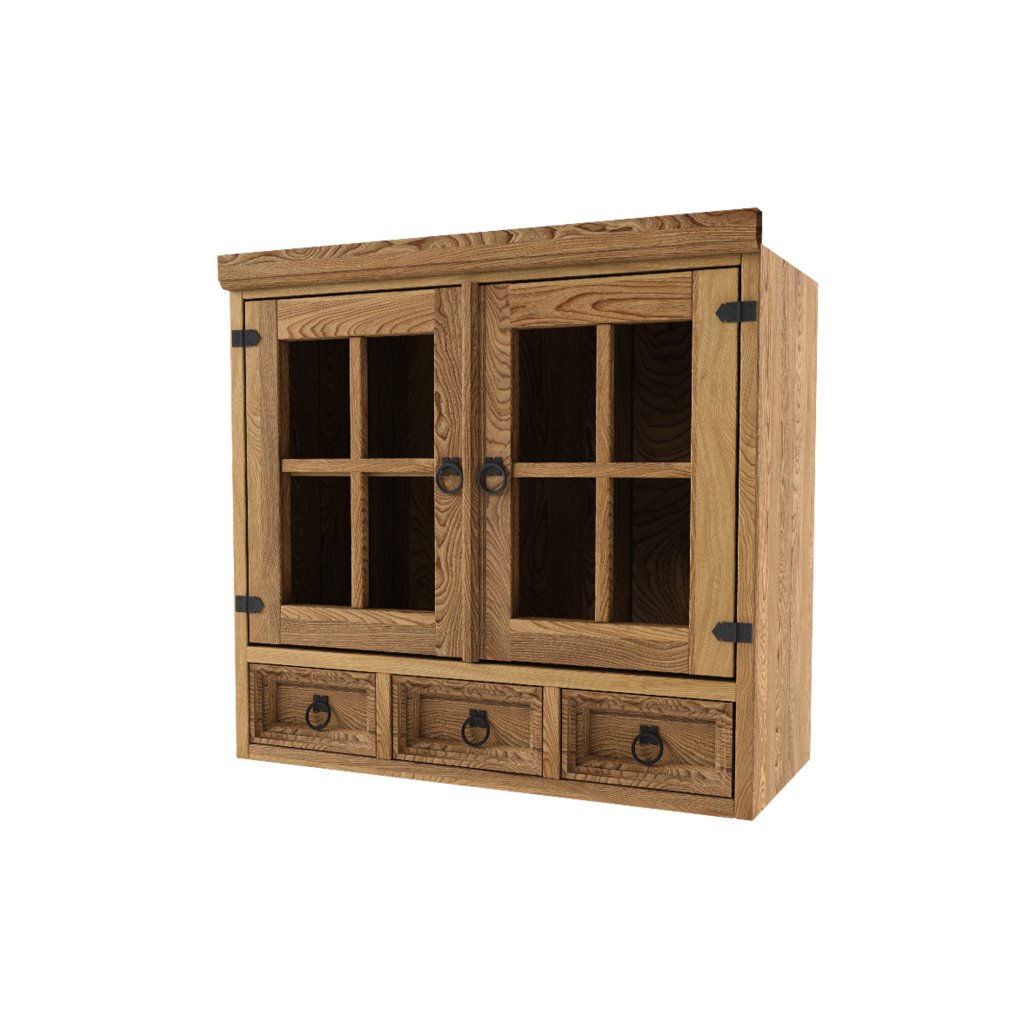 Kuchyňská modulová horní skříňka s prosklenými dvířky a se dvěmi šuplíčky GSS82 je zhotovená z masivní borovice a je ošetřena voskem v barvě dle výběru viz vzorník v galerii. Díky stylovému kování působí tento nábytek elegantním a nadčasovým dojmem. Ve vnitřní části se nahází jedna police. Máte možnost vybrat si z širokého sortimentu kování a úchytů, abyste mohli dát své dřevěné kuchyni ještě osobitější nádech dle vašich představ. Vzory kování naleznete v galerii u produktu.