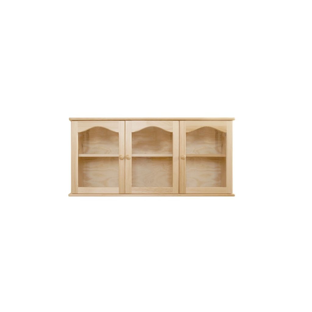 Horní kuchyňská skřínka se sklem z masivu DEJ50 je velmi originální a tvarově atypická. Tato vitrína je rozdělená do dvou samostatných částí a je uzavíratelná 3 prosklenými dvířkami. V každé části je jedna polička. Závěsná skřínka DEJ50 je vyrobená z masivního borovicového dřeva s důrazem na využití minimálního množství suků.