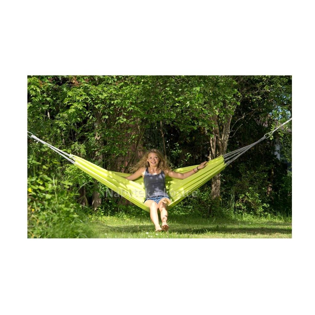 Houpací síť Florida kiwi je vyrobena z kvalitního materiálu, který nepodlého vodě a nevadí mu ani nepříznivé počasí. Látka je na okrajích zpevněna obroubením a spojena se spletenými dlouhými šňůrami, které mají na koncích závěsná oka. Lze prát na 30°C.