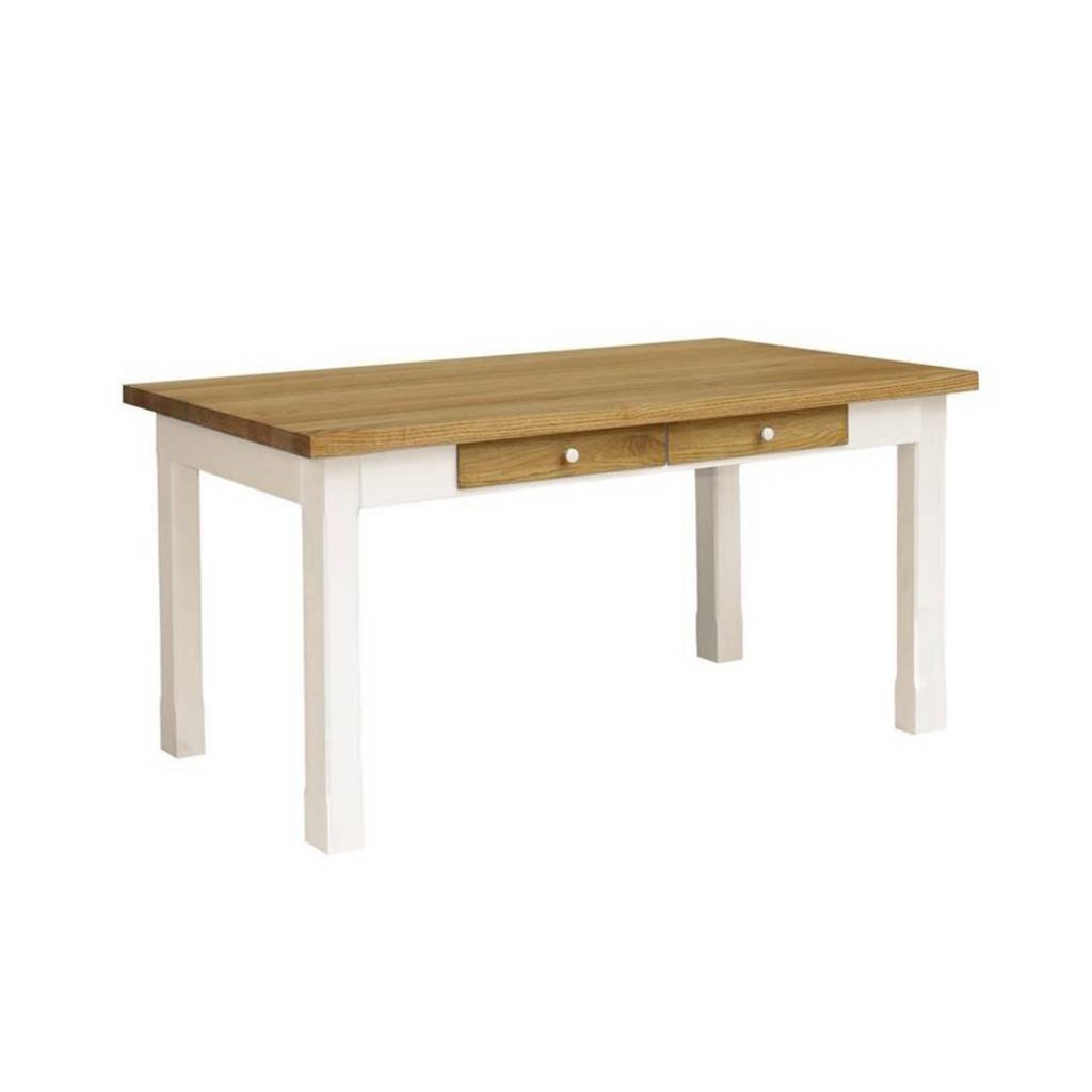 Masivní jídelní stůl PROVENCE je vyroben z masivního borovicového dřeva. Horní deska stolu může být vyrobena z borovicového anebo dubového dřeva. Deska stolu (2,7 cm) je ošetřena lakem a nohy stolu akrylovou barvou v krémové barvě. Šuplíky jsou bez pojezdu. Možnost objednání se systémem tichého dovírání (u šuplíků). Příplatek 810,- Kč (jeden pár). Úchytky lze objednat i v černé a zlaté variantě (v případě zájmu uveďte tuto informaci do poznámky při objednávce).