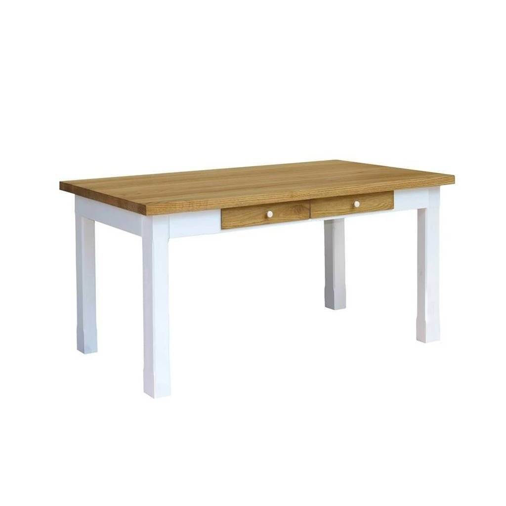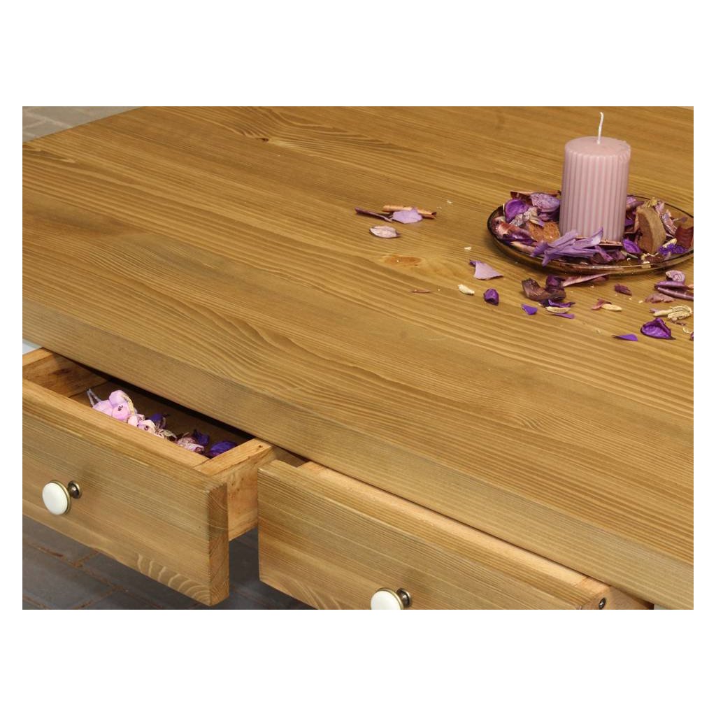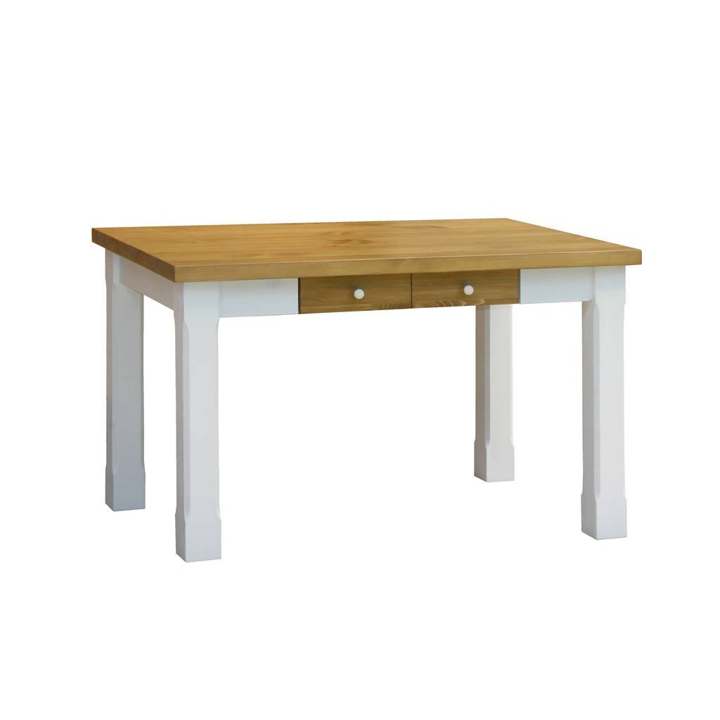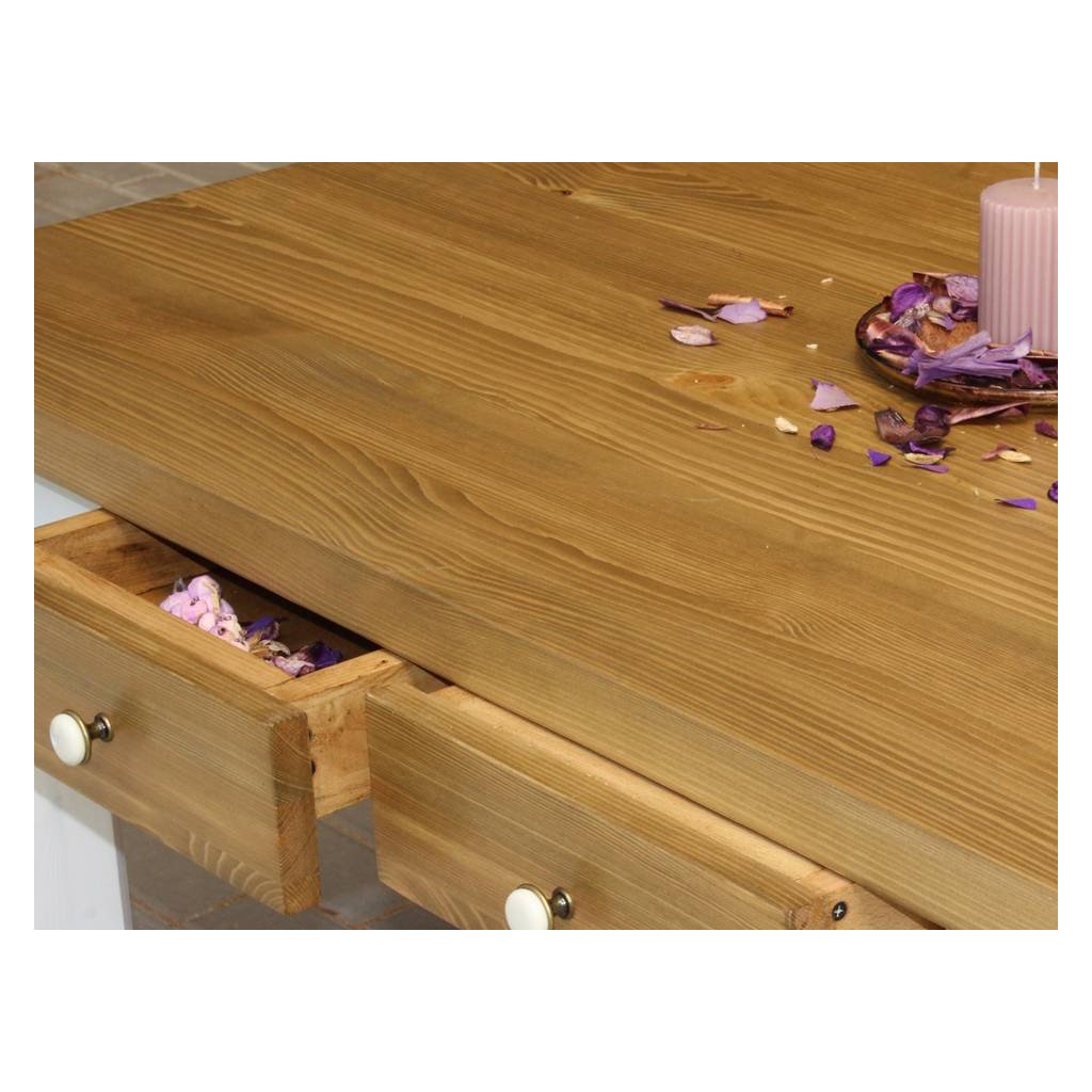 Masivní jídelní stůl PROVENCE je vyroben z masivního borovicového dřeva. Horní deska stolu může být vyrobena z borovicového anebo dubového dřeva. Deska stolu (2,7 cm) je ošetřena lakem a nohy stolu akrylovou barvou v bílé či šedomodré barvě. Šuplíky jsou bez pojezdu. Možnost objednání se systémem tichého dovírání (u šuplíků). Příplatek 810,- Kč (jeden pár).
