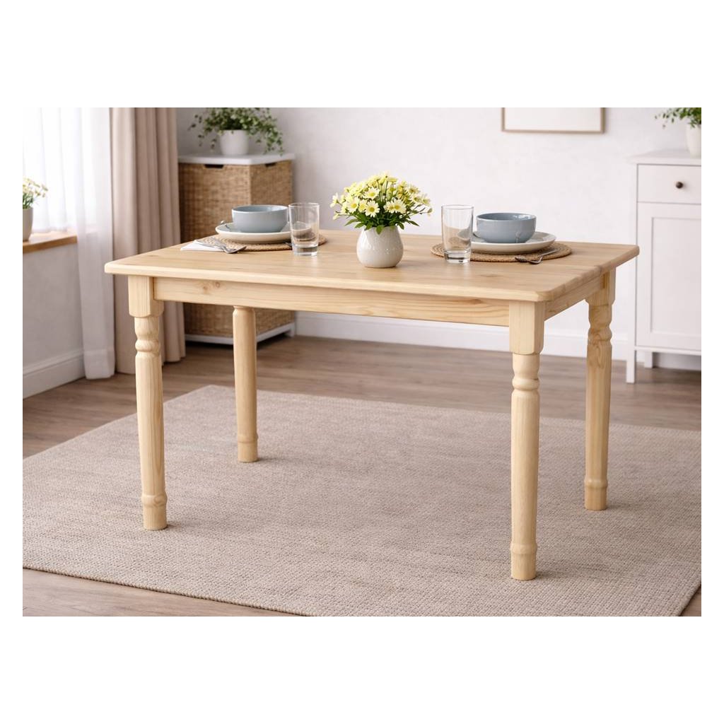 Jídelní stůl působí díky masivním vyřezávaným nohám velmi elegantně a masivně. Jistě se stane ozdobou vaší jídelny nebo pokoje. Tento jídelní stůl je vyroben z borovicového masívu a má přírodní barvu. Je vhodný i k nábytku z masivu jako jsou komody nebo vitríny. K tomuto stolu doporučujeme židle z masivu.