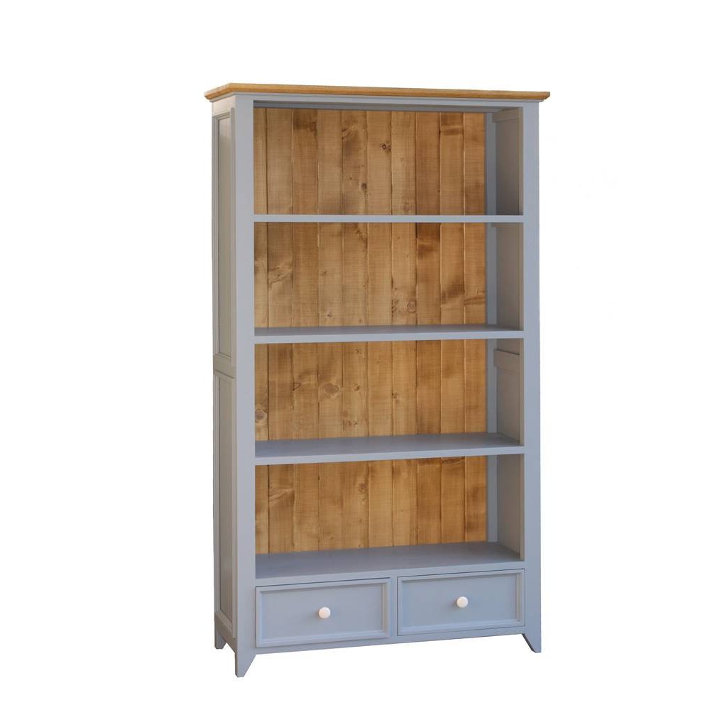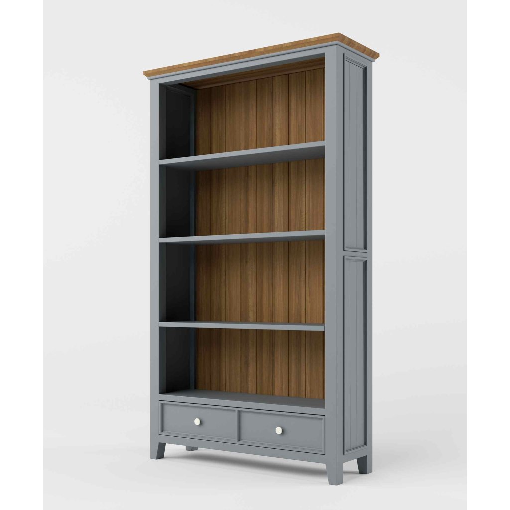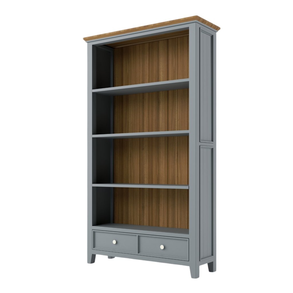 Knihovna z masivu PROVENCE je spojením bukového a dubového dřeva. Dubové dřevo (horní deska) je ošetřeno lakem a bukové dřevo je ošetřeno akrylovou barvou v šedomodré barvě. Šuplíky jsou bez pojezdů. Možnost objednání se systémem tichého dovírání (u šuplíků).