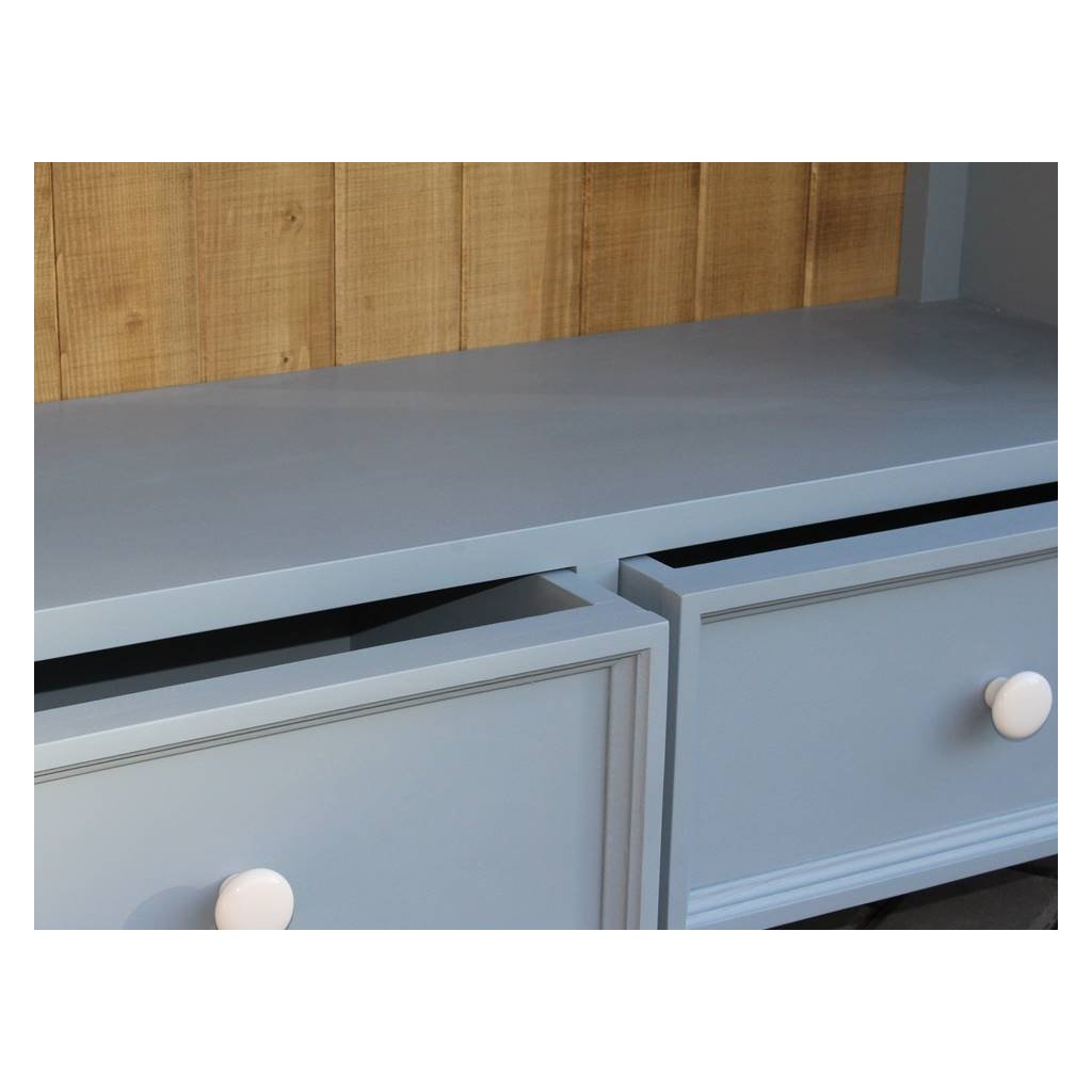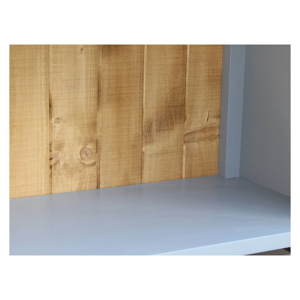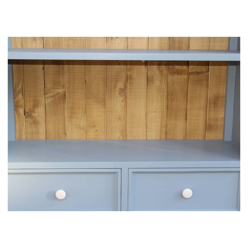 Knihovna z masivu PROVENCE je spojením bukového a dubového dřeva. Dubové dřevo (horní deska) je ošetřeno lakem a bukové dřevo je ošetřeno akrylovou barvou v šedomodré barvě. Šuplíky jsou bez pojezdů. Možnost objednání se systémem tichého dovírání (u šuplíků).