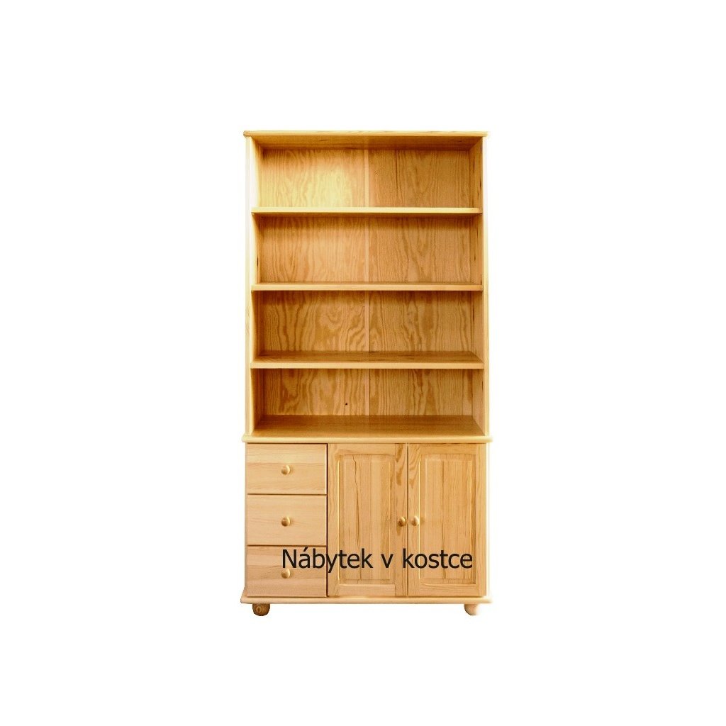 Knihovna z masivu DEJ43 se dokonale hodí pro Vaše knihy nebo jiné cennosti. Tato vitrína obsahuje tři pevné poličky, na které můžete uložit knihy, porcelán nebo jakékoliv cennosti, tři výsuvné šuplíky a jednu poličku za dvěmi zavřenými dvířky. Všechny šuplíky jsou na kvalitních kovových pojezdech. Celá knihovna je postavena na kulatých nožkách. Vitrína DEJ43 je vyrobená z masivního borovicového dřeva s důrazem na využití minimálního množství suků.