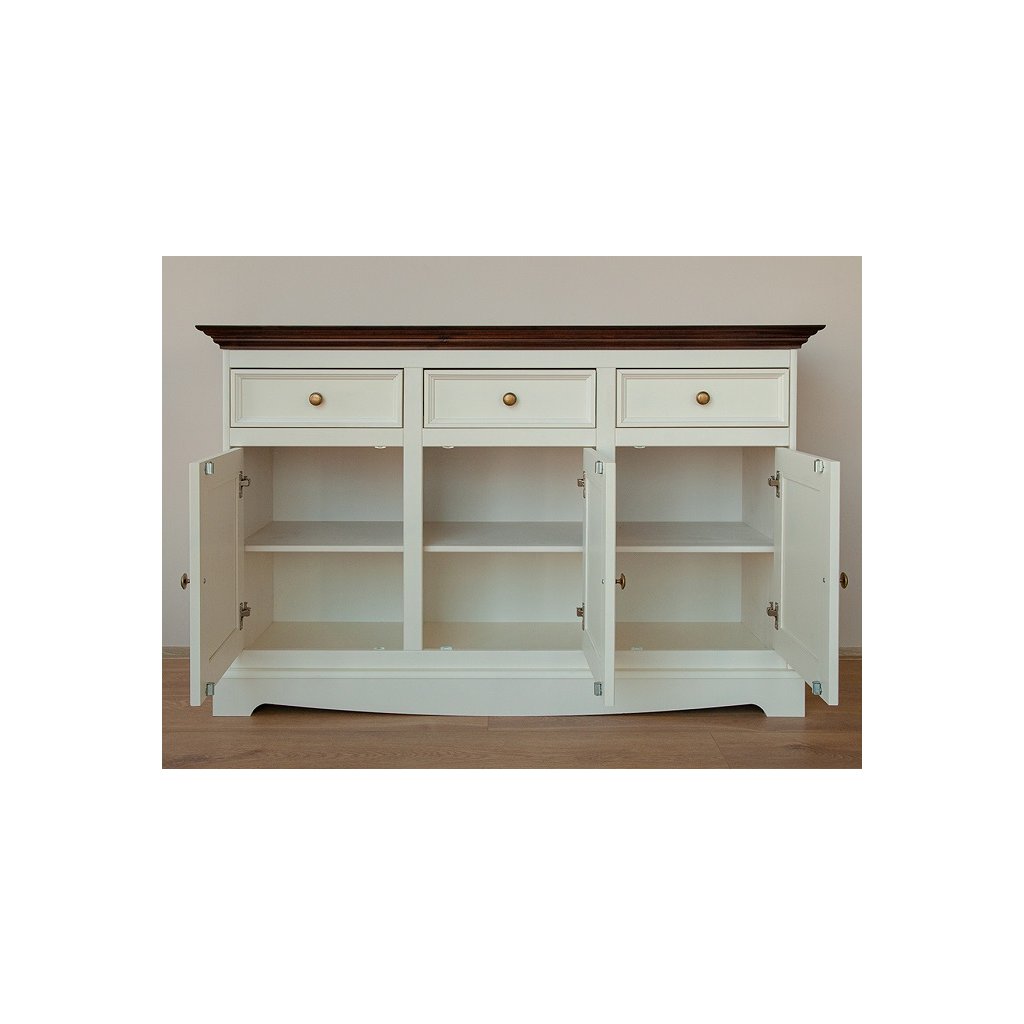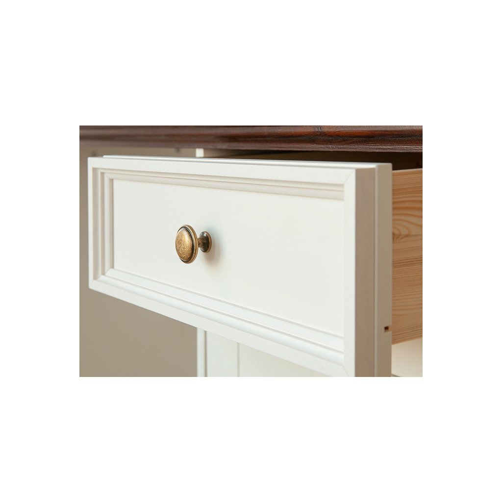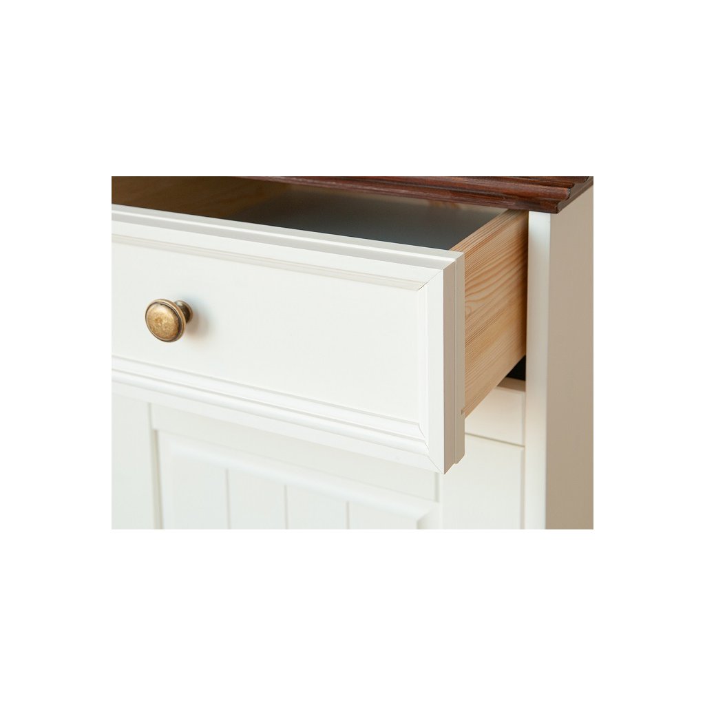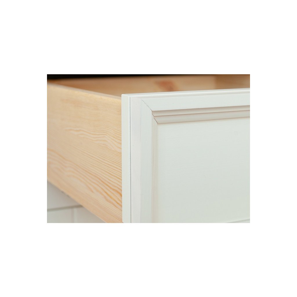 Rustikální komoda BELLUNO Elegante z masivu je vyrobena z masivní finské borovice. Teplá bílá barva, která pokrývá povrch nábytku, krásně vyplní interiéry v provensálském stylu, ale i interiéry ve skandinávském stylu. Finská borovice vyniká svojí odolností a nádhernou dřevitou strukturou, kterou můžeme cítit, při každém doteku.