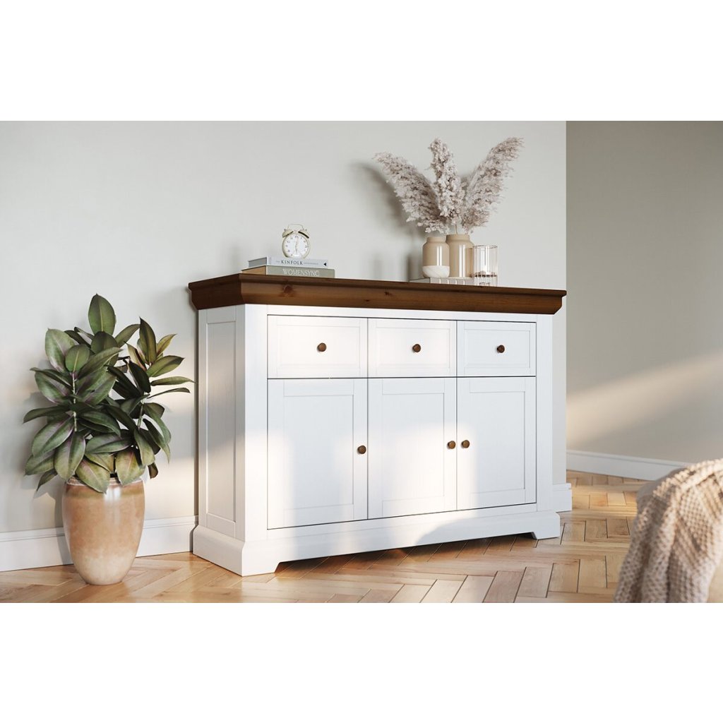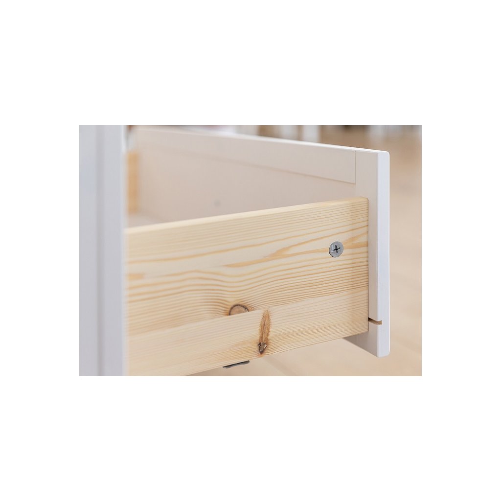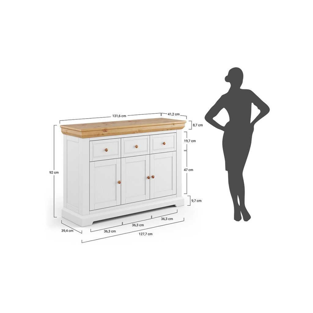 Zařizujete byt a přemýšlíte, kam schováte všechny doklady, talíře nebo oblečení? Stylová dřevěná komoda Maze Elite, je vybavena třemi šuplíky a prostornými skříňkami, a skýtá prostory pro uložení nejen všech, jíž zmiňovaných věcí. Provensálský styl je zdůrazněn přírodními, jasnými barvami v barvě přírodní borovice a bílé. Frézy a lišty na čelech dokonale ladí s provensálským stylem. Šuplíky jsou doplněny o systém tichého dovírání.
