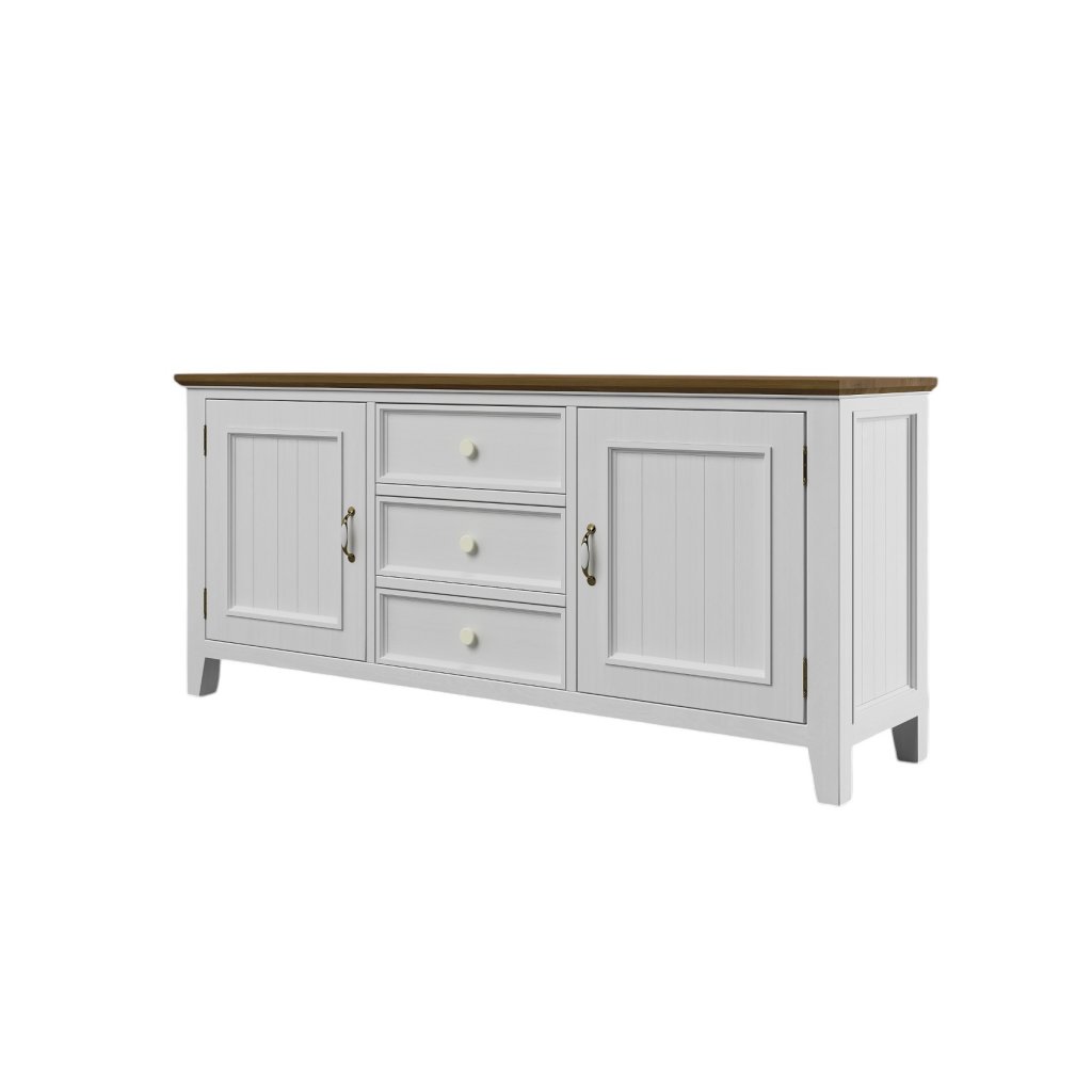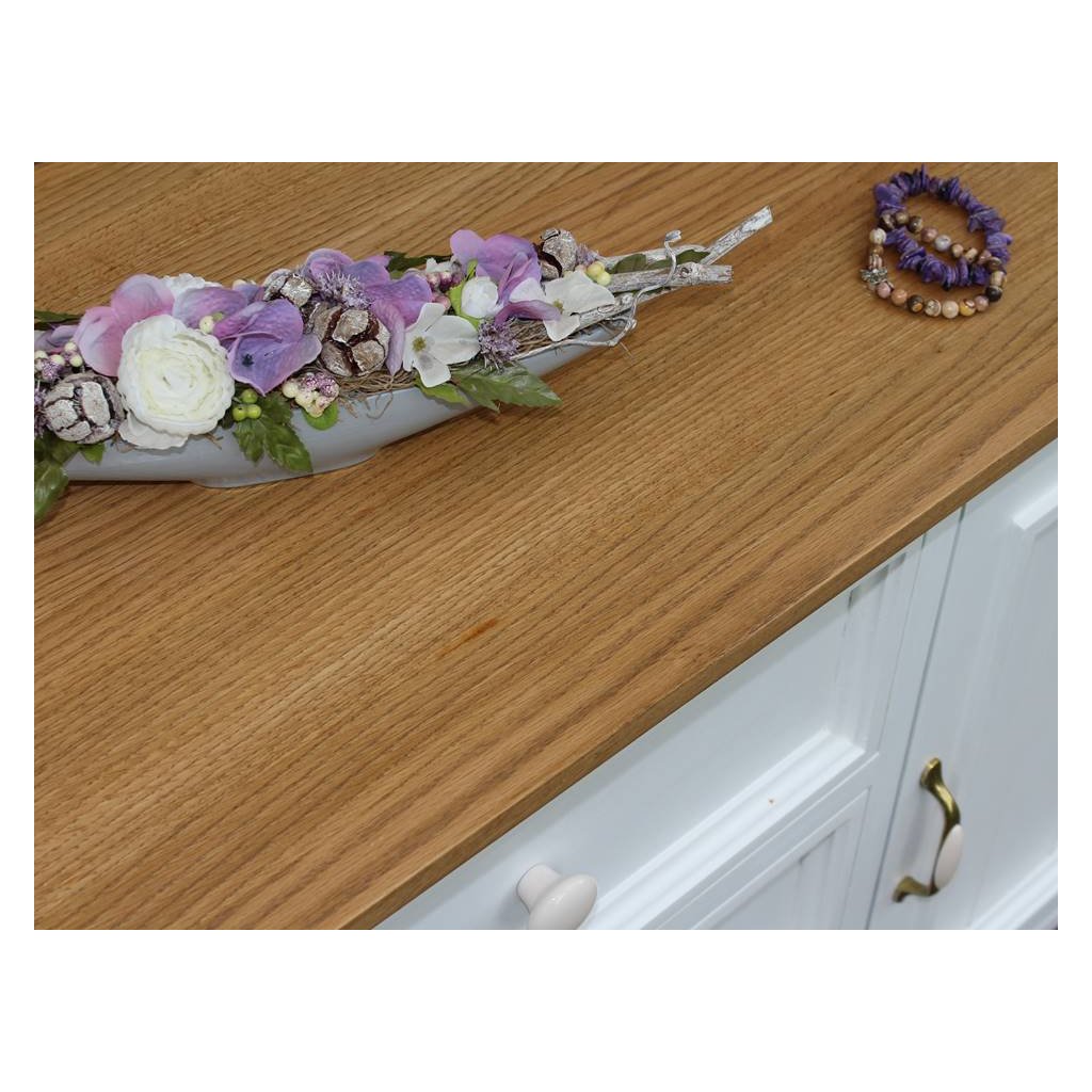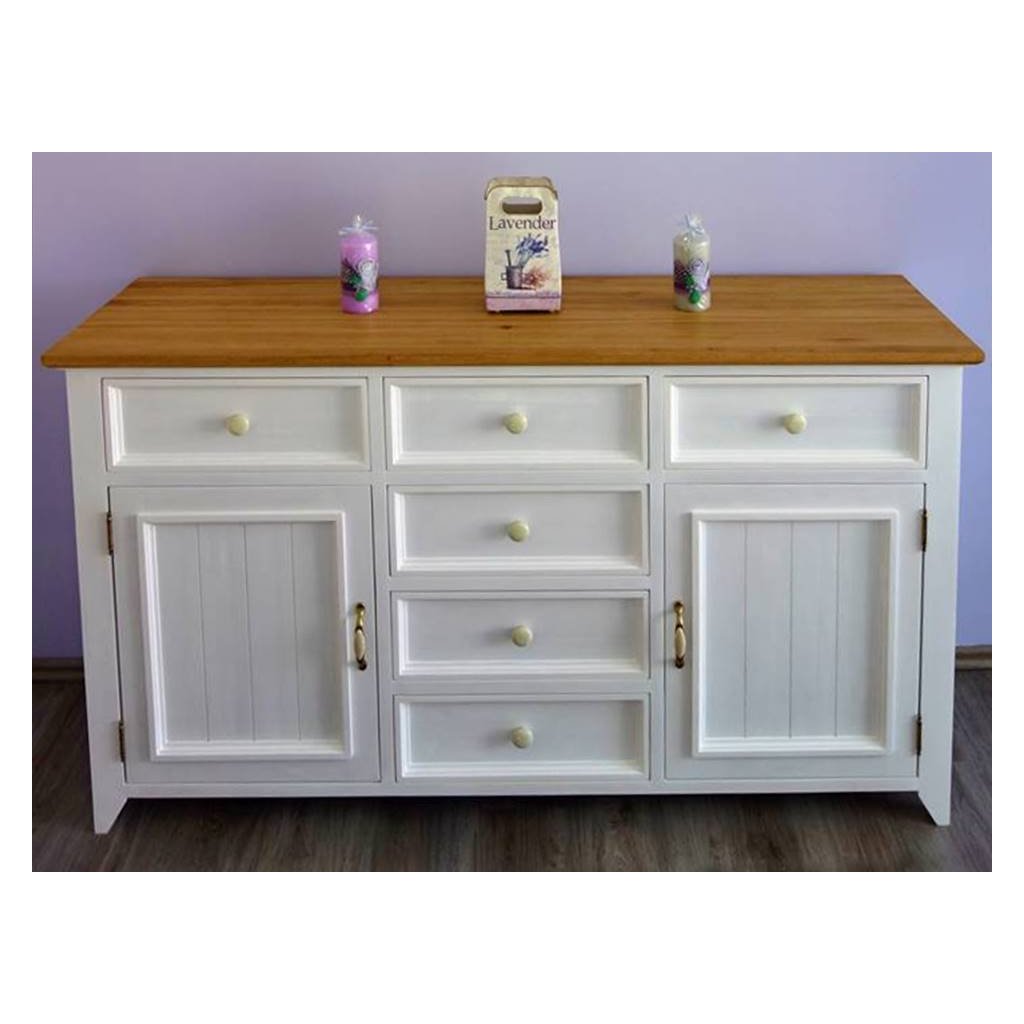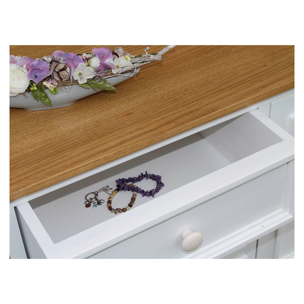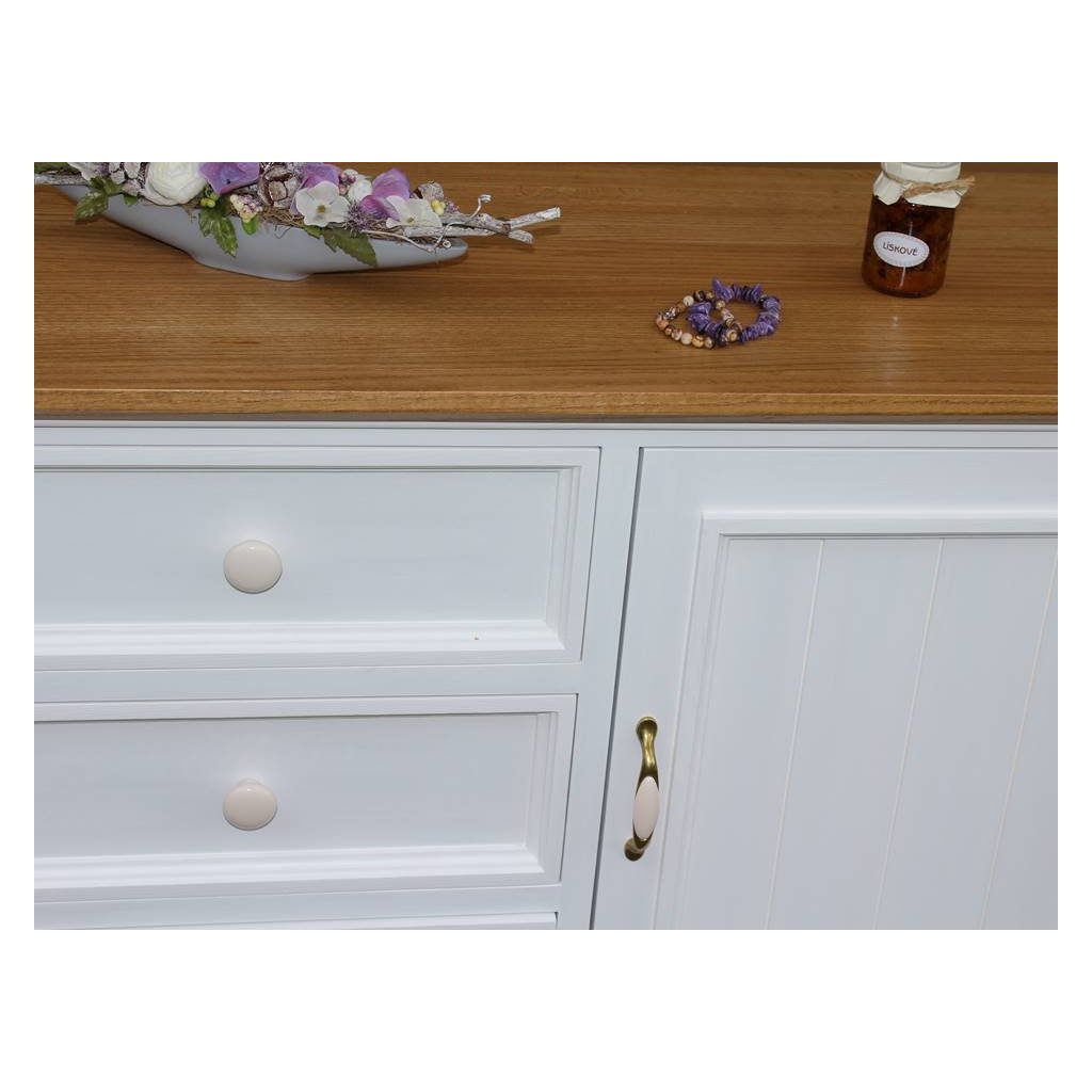 Masivní komoda PROVENCE je spojením bukového a dubového dřeva. Dubové dřevo (horní deska) je ošetřeno lakem a bukové dřevo je ošetřeno akrylovou barvou v bílé barvě. Šuplíky jsou bez pojezdu.