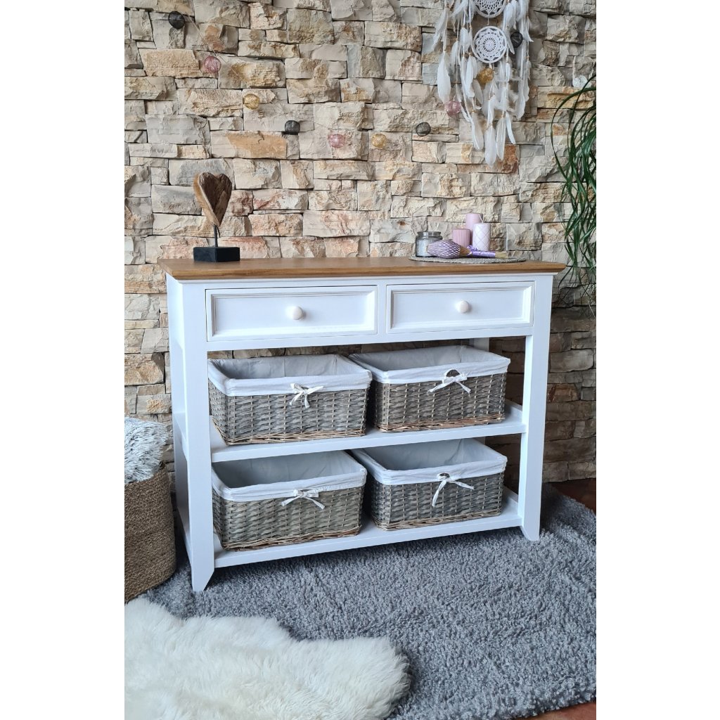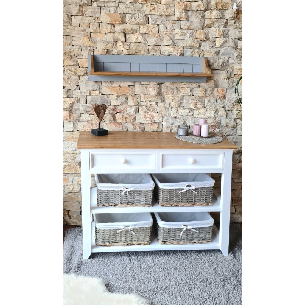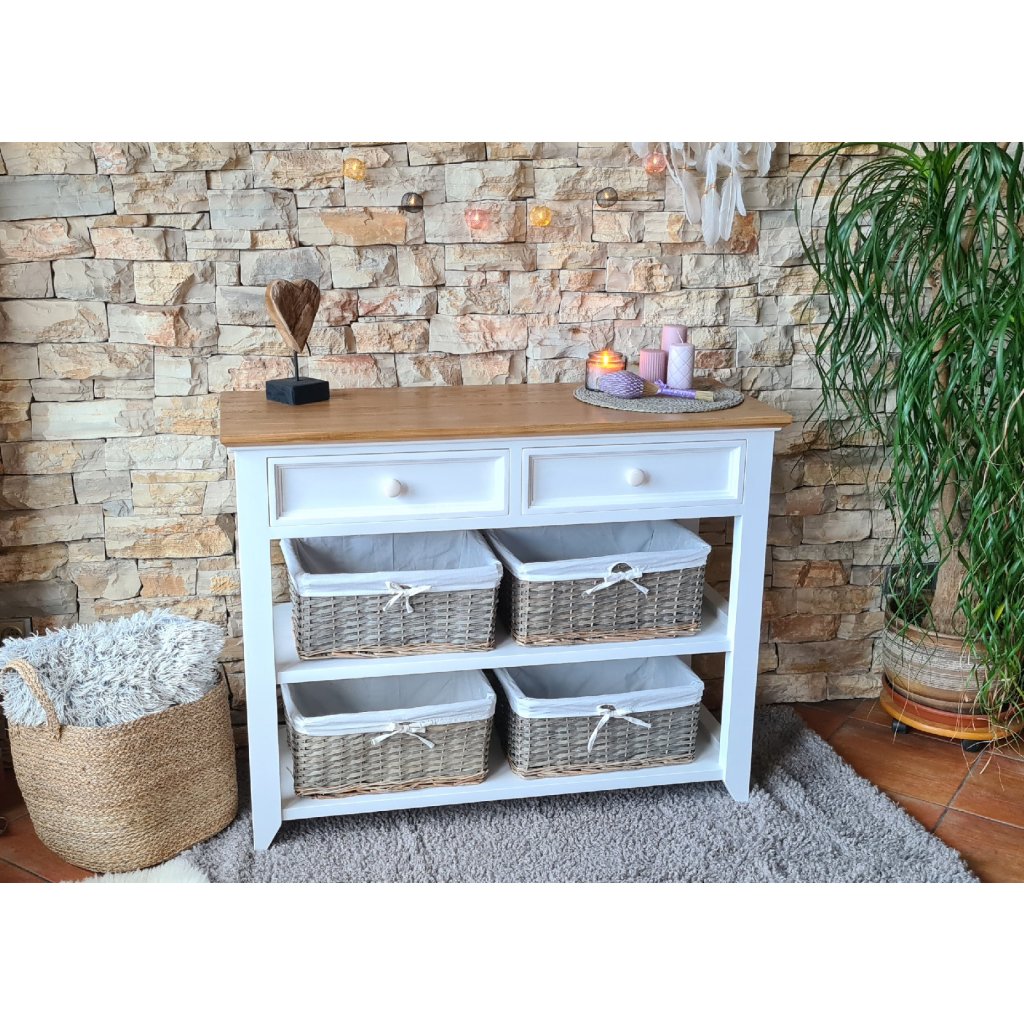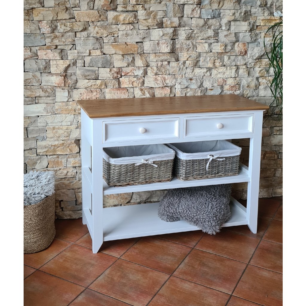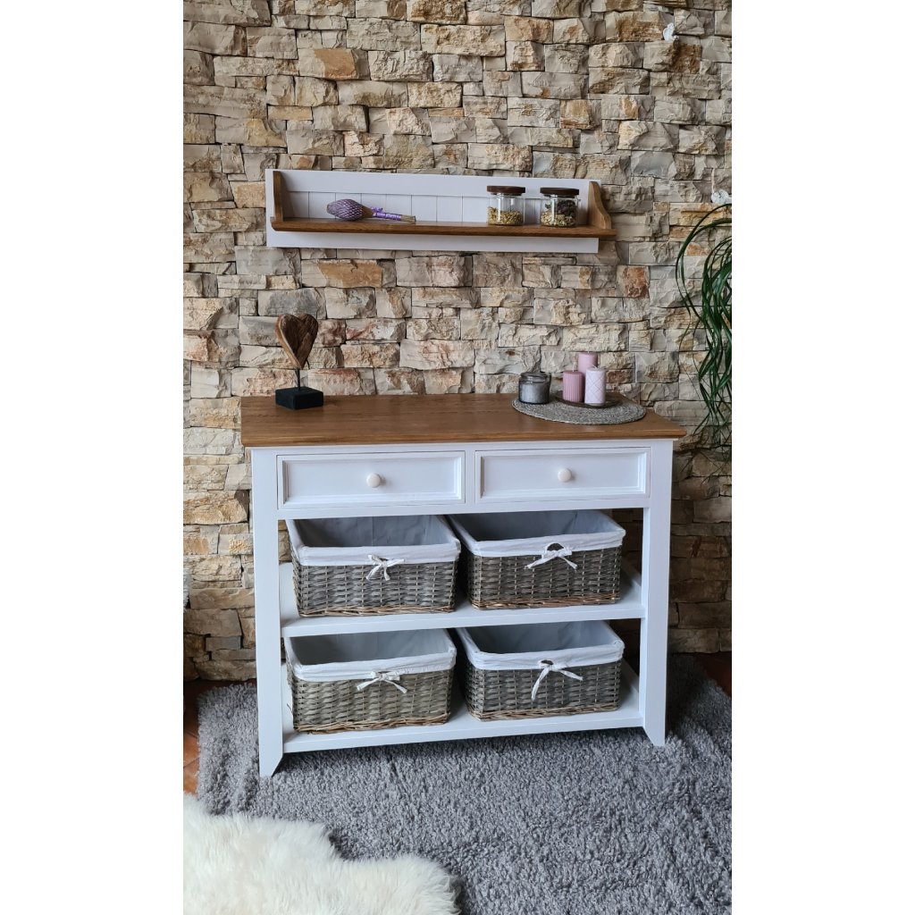 Masivní komoda PROVENCE je spojením bukového a dubového dřeva. Dubové dřevo (horní deska) je ošetřeno lakem a bukové dřevo je ošetřeno akrylovou barvou v bílé, krémové, olivové či šedomodré barvě. Šuplíky jsou bez pojezdu. Možnost objednání se systémem tichého dovírání (u šuplíků). Součástí komody nejsou dekorace.