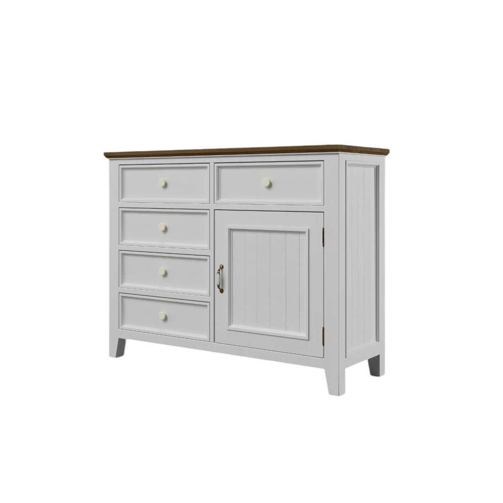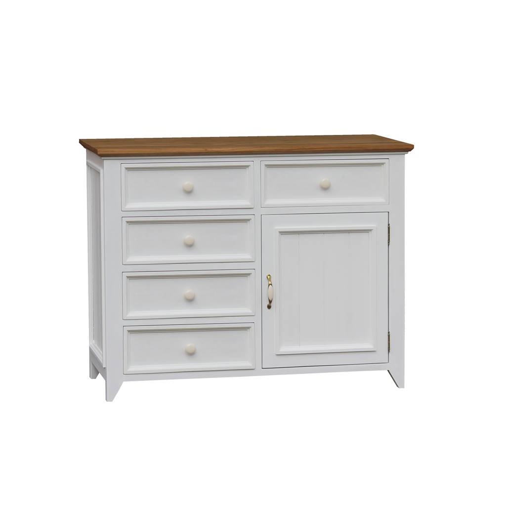Komoda z masivu PROVENCE je spojením bukového a dubového dřeva. Dubové dřevo (horní deska) je ošetřeno lakem a bukové dřevo je ošetřeno akrylovou barvou v bílé barvě. Šuplíky jsou bez pojezdu. Možnost objednání se systémem tichého dovírání (u šuplíků) - cena na dotaz.