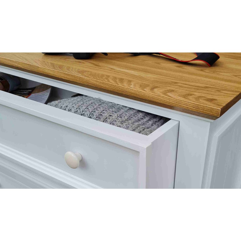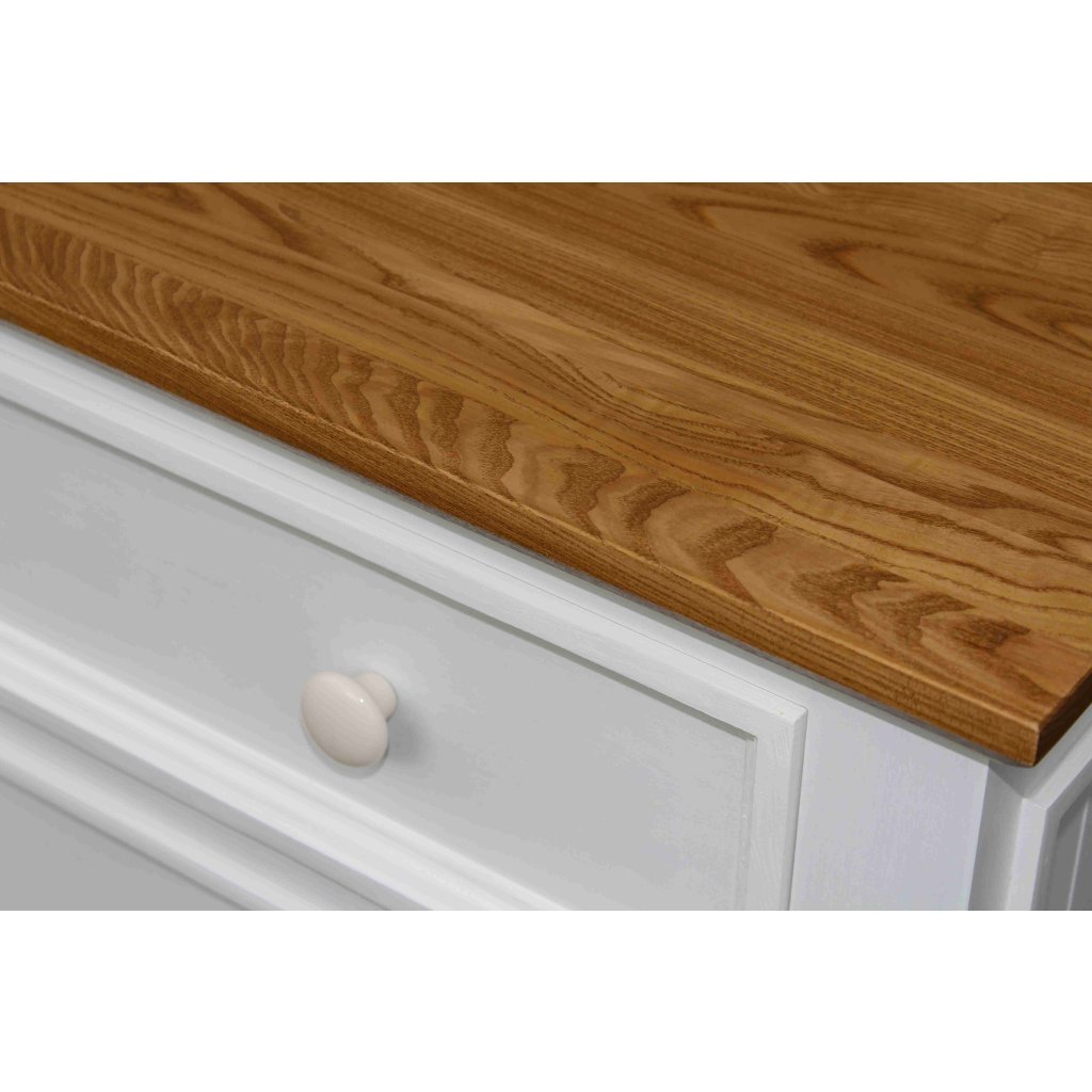 Komoda z masivu PROVENCE je spojením bukového a dubového dřeva. Dubové dřevo (horní deska) je ošetřeno lakem a bukové dřevo je ošetřeno akrylovou barvou v bílé barvě. Šuplíky jsou bez pojezdu. Možnost objednání se systémem tichého dovírání (u šuplíků) - cena na dotaz.