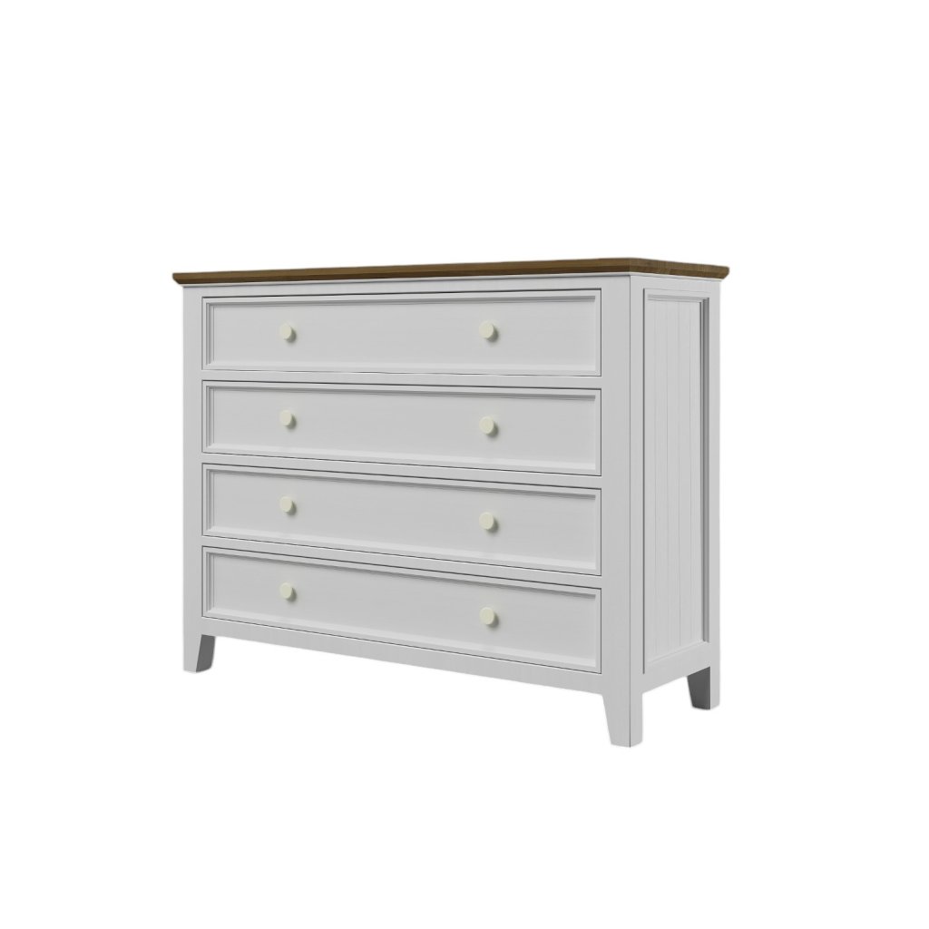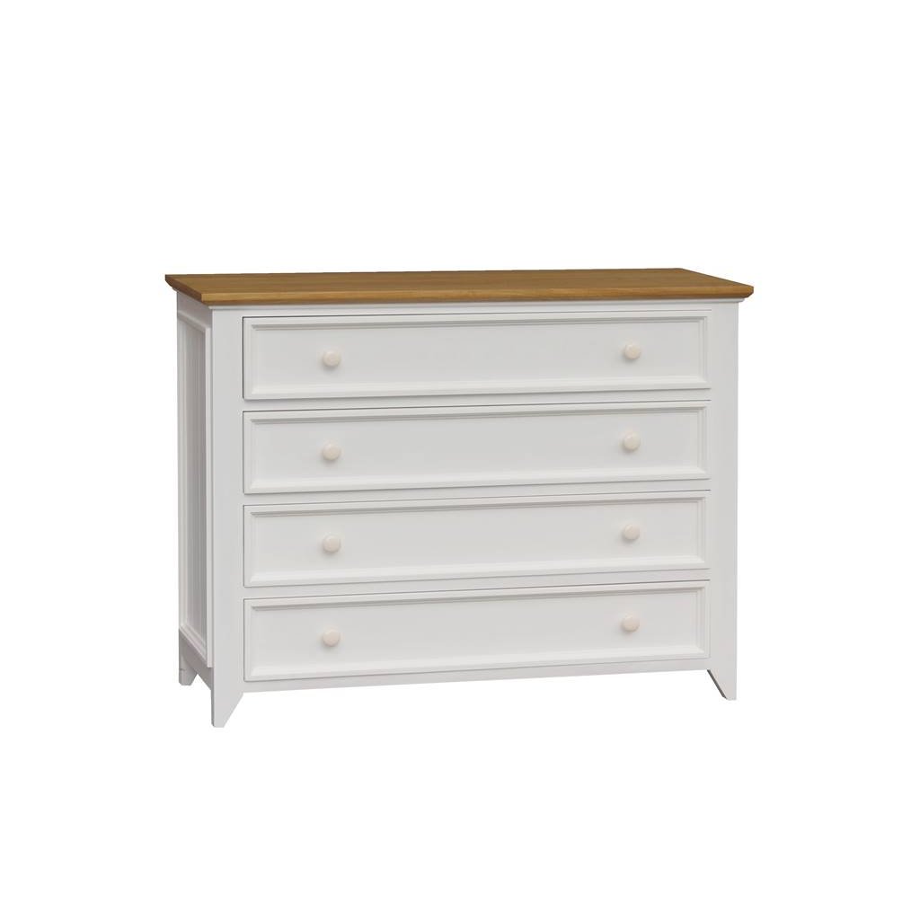 Komoda z masivu PROVENCE je spojením bukového a dubového dřeva. Dubové dřevo (horní deska) je ošetřeno lakem a bukové dřevo je ošetřeno akrylovou barvou v bílé barvě. Šuplíky jsou bez pojezdu. Možnost objednání se systémem tichého dovírání (u šuplíků).