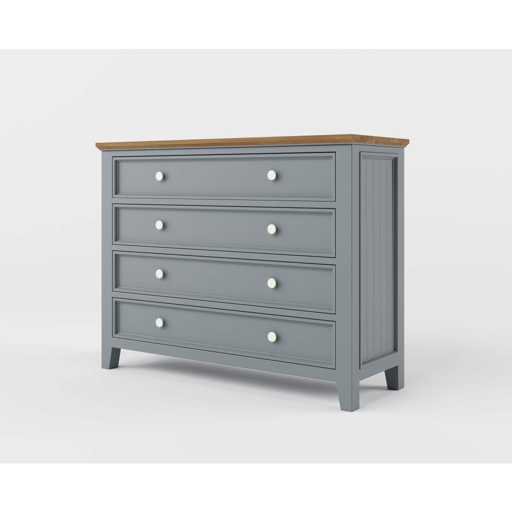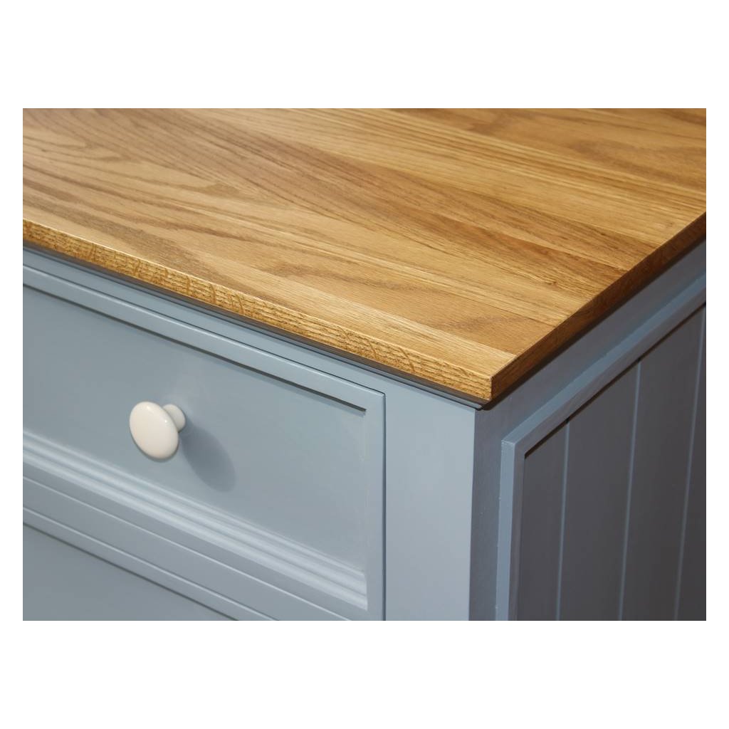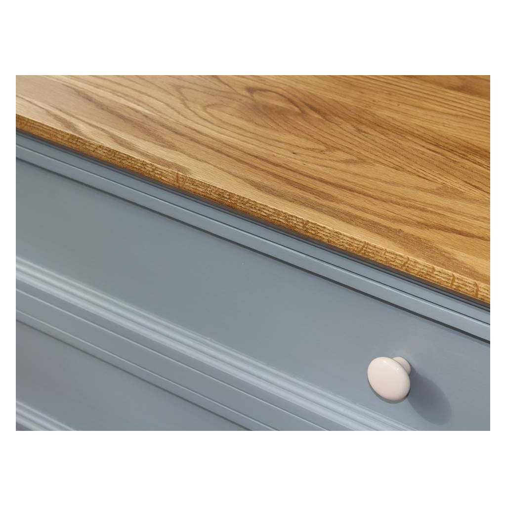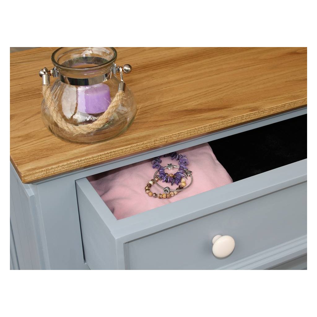 Komoda z masivu PROVENCE je spojením bukového a dubového dřeva. Dubové dřevo (horní deska) je ošetřeno lakem a bukové dřevo je ošetřeno akrylovou barvou v šedomodré barvě. Šuplíky jsou bez pojezdu. Možnost objednání se systémem tichého dovírání (u šuplíků).