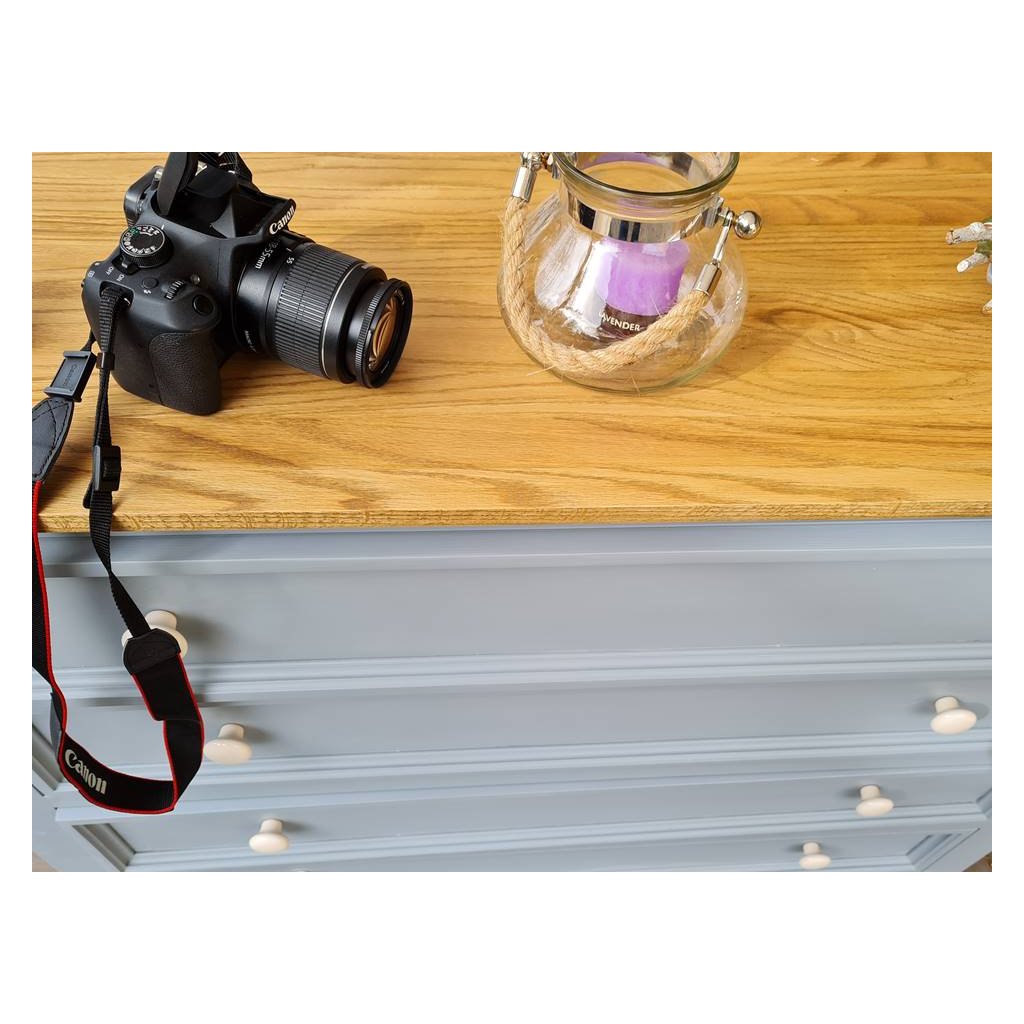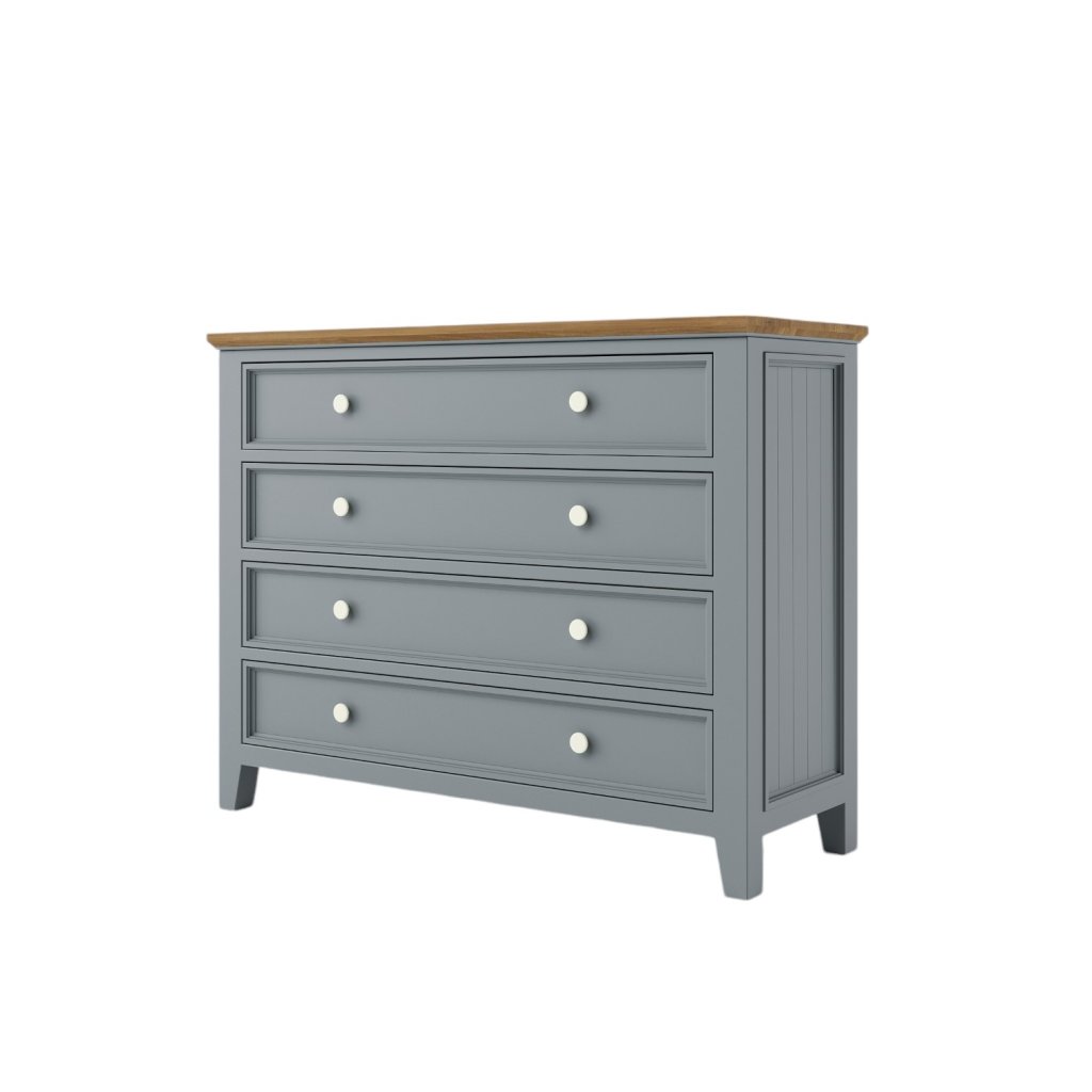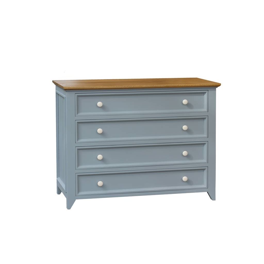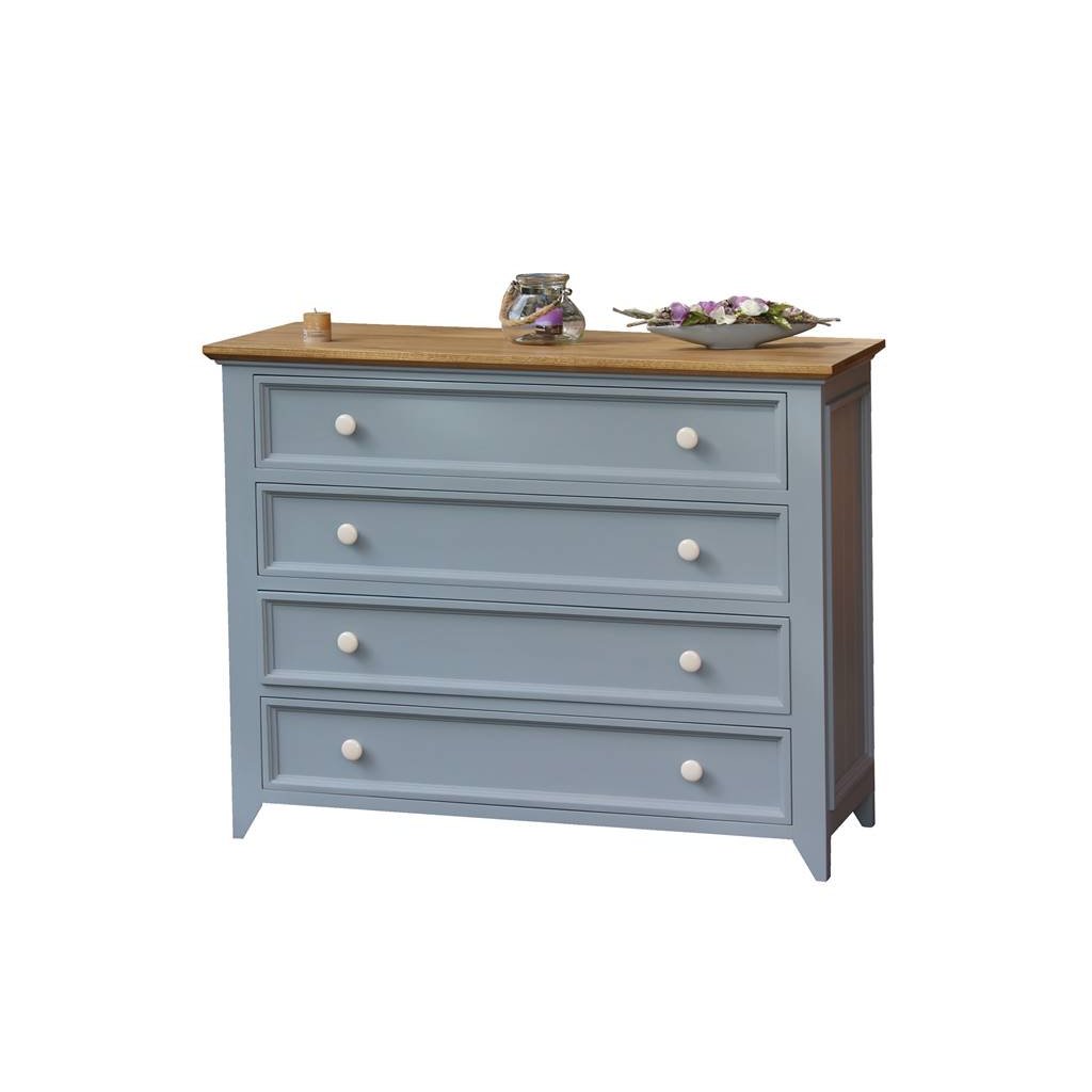 Komoda z masivu PROVENCE je spojením bukového a dubového dřeva. Dubové dřevo (horní deska) je ošetřeno lakem a bukové dřevo je ošetřeno akrylovou barvou v šedomodré barvě. Šuplíky jsou bez pojezdu. Možnost objednání se systémem tichého dovírání (u šuplíků).