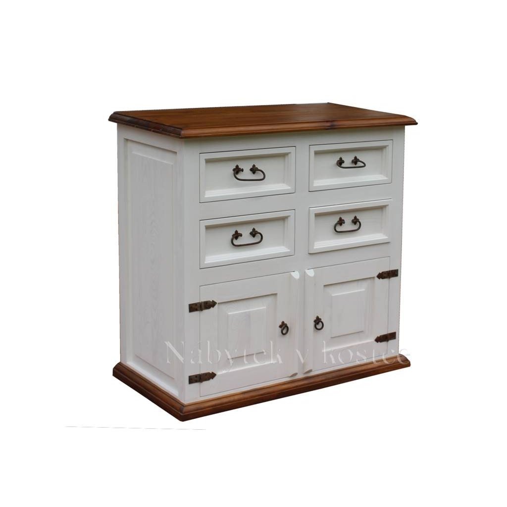 Rustikální komoda SWEET HOME COM18 je masivní komoda vyrobena z borovicového masivního dřeva (zadní stranu tvoří dřevěná dýha) a ošetřena bílou vodou ředitelnou barvou. Horní hnědé plochy mohou být ošetřeny voskem anebo lakem. Pro snazší údržbu doporučujeme objednat nábytek s vrchní hnědou deskou v lakované verzi.