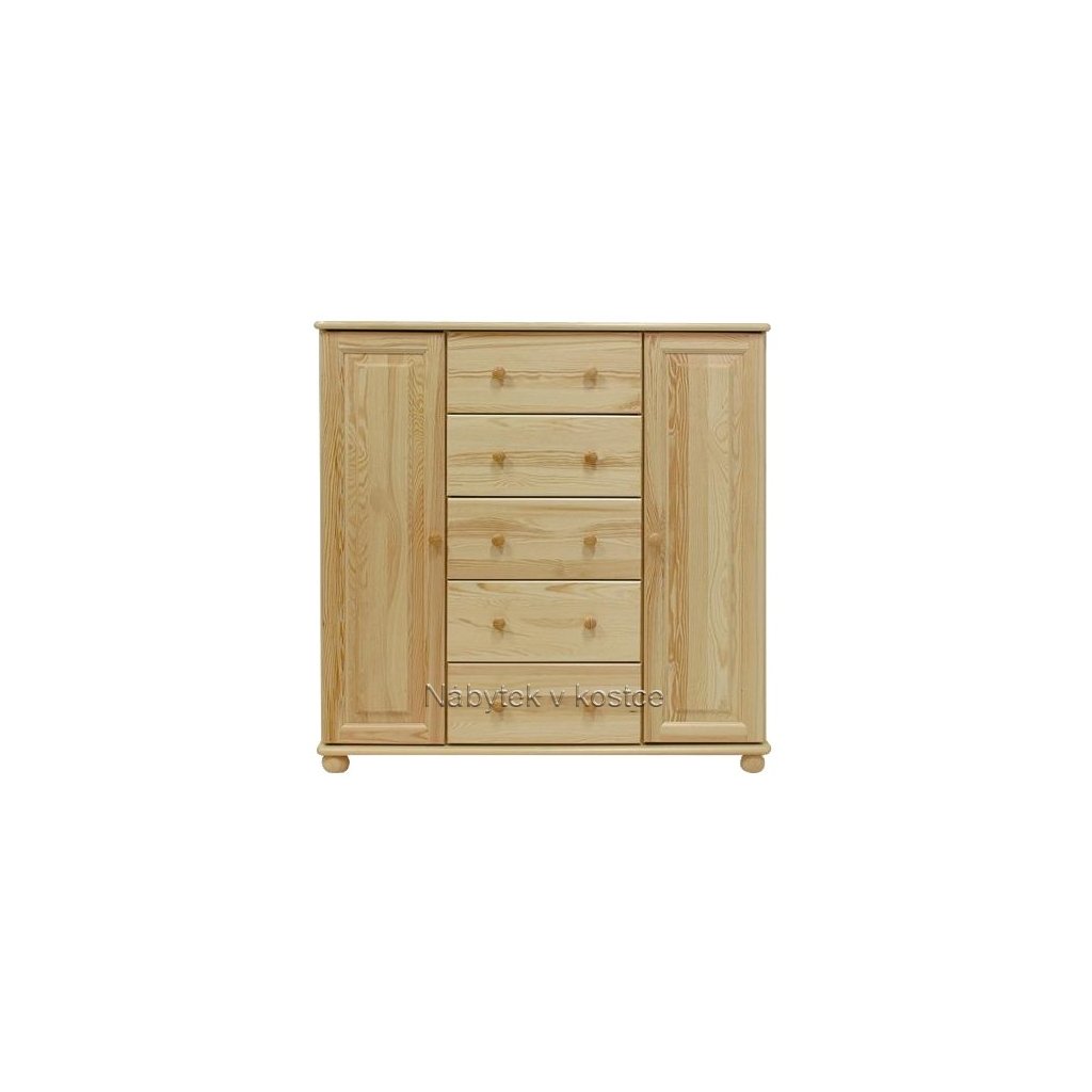 Komoda z masivu Šumava 60 je vyrobená z jakostního borovicového dřeva v přírodním stylu. Je ošetřená jen bezbarvým lakem, který podtrhne přírodní vzhled dřeva a zároveň ji ochrání proti případným oděrkám. Komoda má k dispozici pět šuplíků s kovovými pojezdy pro snadné vysouvání a dvě samostatné skříňky s ozdobným frézováním na dvířkách. Eleganci vnášejí použité kulaté úchyty, které mají totožný tvar jako masivní nohy této komody. Zadní stranu komody tvoří sololit, což je dřevovláknitá deska, vyrobená na bázi dřeva.