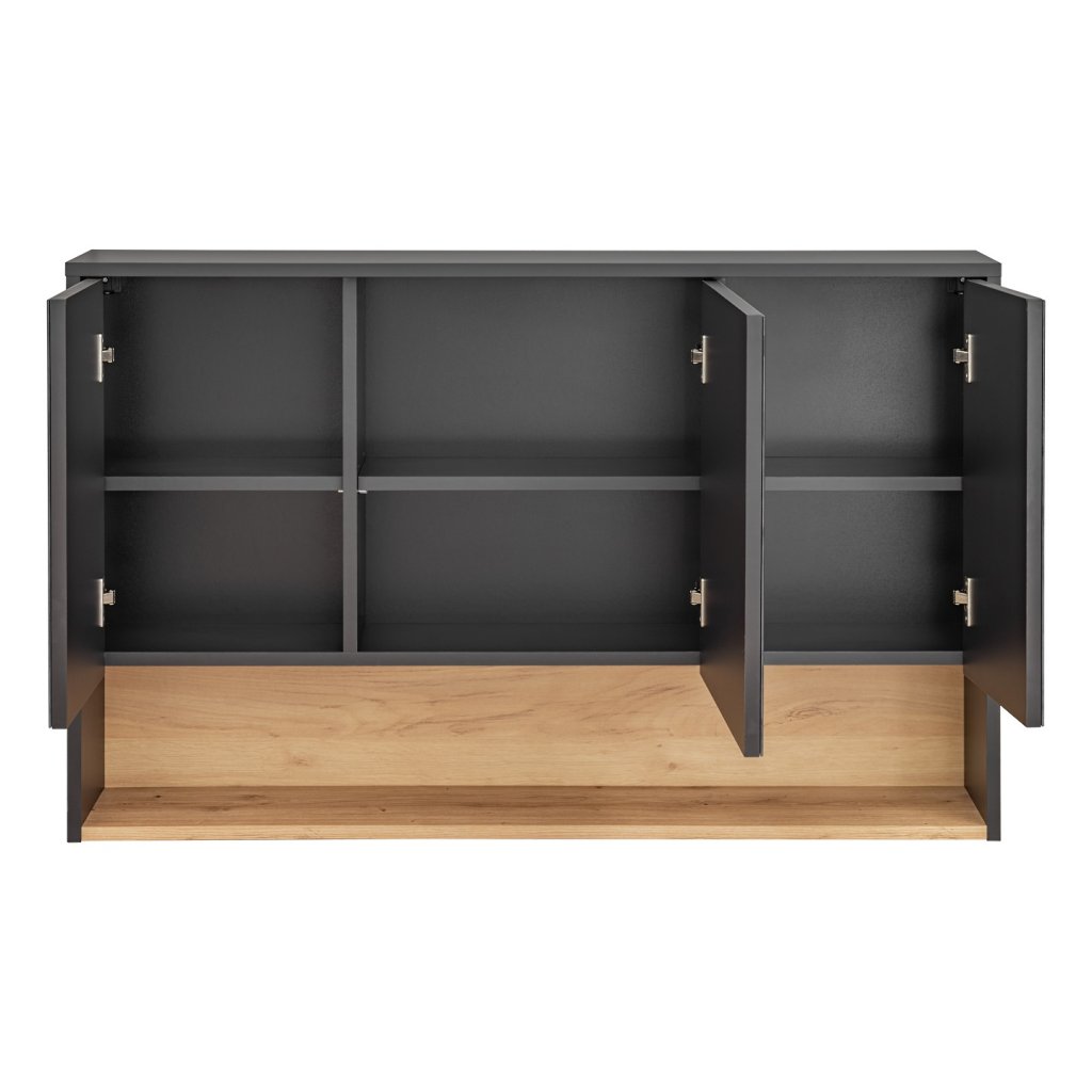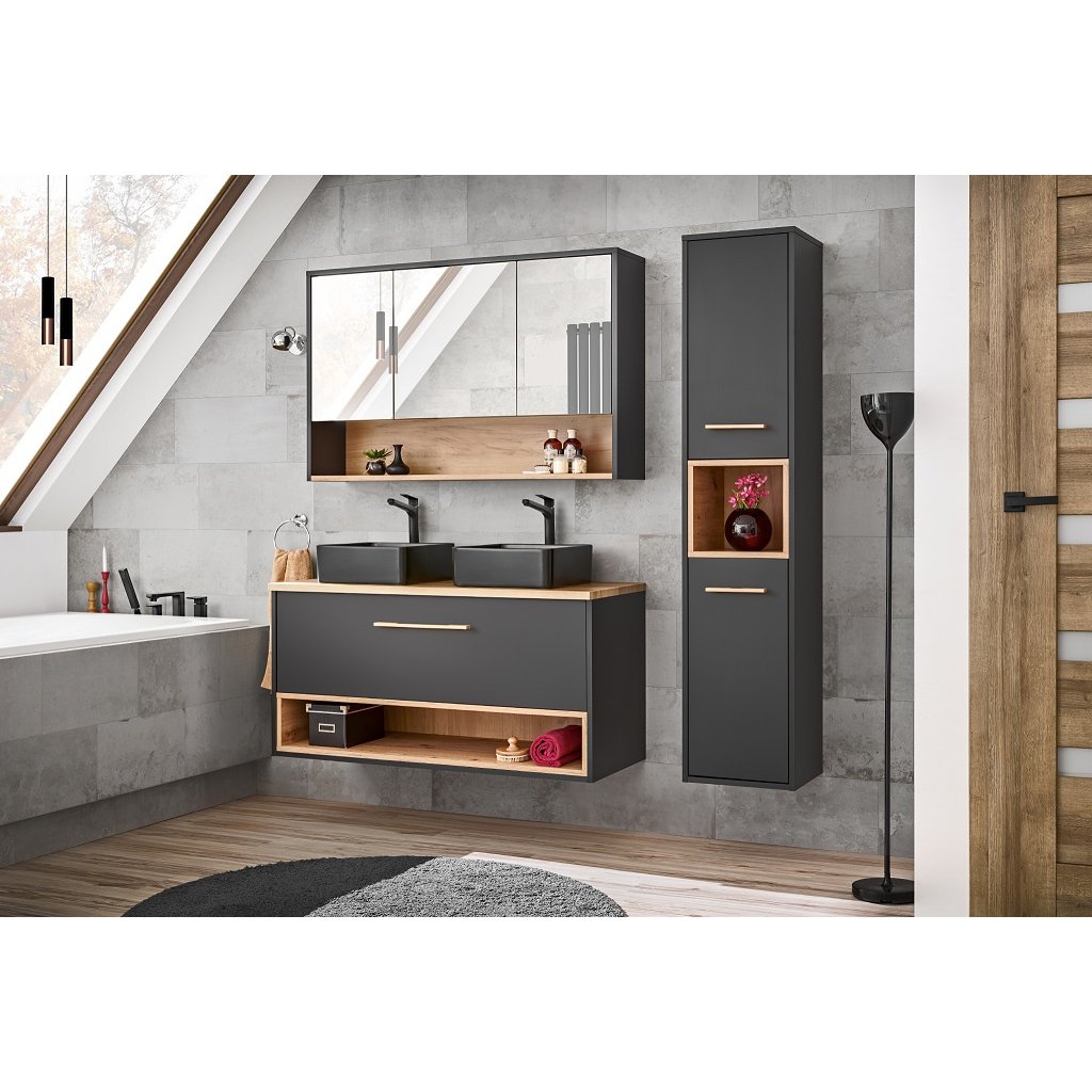 Prezentovaná zrcadlová skříňka je vyrobena z kvalitního lamina šedé barvy, která působí velice moderně. Dvířka skříňky jsou opatřena zrcadlovou plochou. Ve spodní části skříňky se nachází otevřená police s hřejivým dřevěným dekorem barvy dub artisan. Kombinace dřevěného dekoru a moderní tmavě šedé barvy působí velice příjemným dojmem a podpoří vytvoření útulné atmosféry ve vaší koupelně.