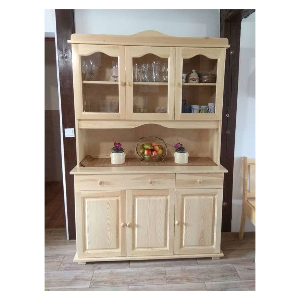Kredenc z masivu BIANCA Irys je stylová klasická kredenc, která je vyrobená z masivního borovicového dřeva a ošetřena bezbarvým lakem, pro snadnější údržbu. Zadní část kredence je vyrobena rovněž ze dřeva.